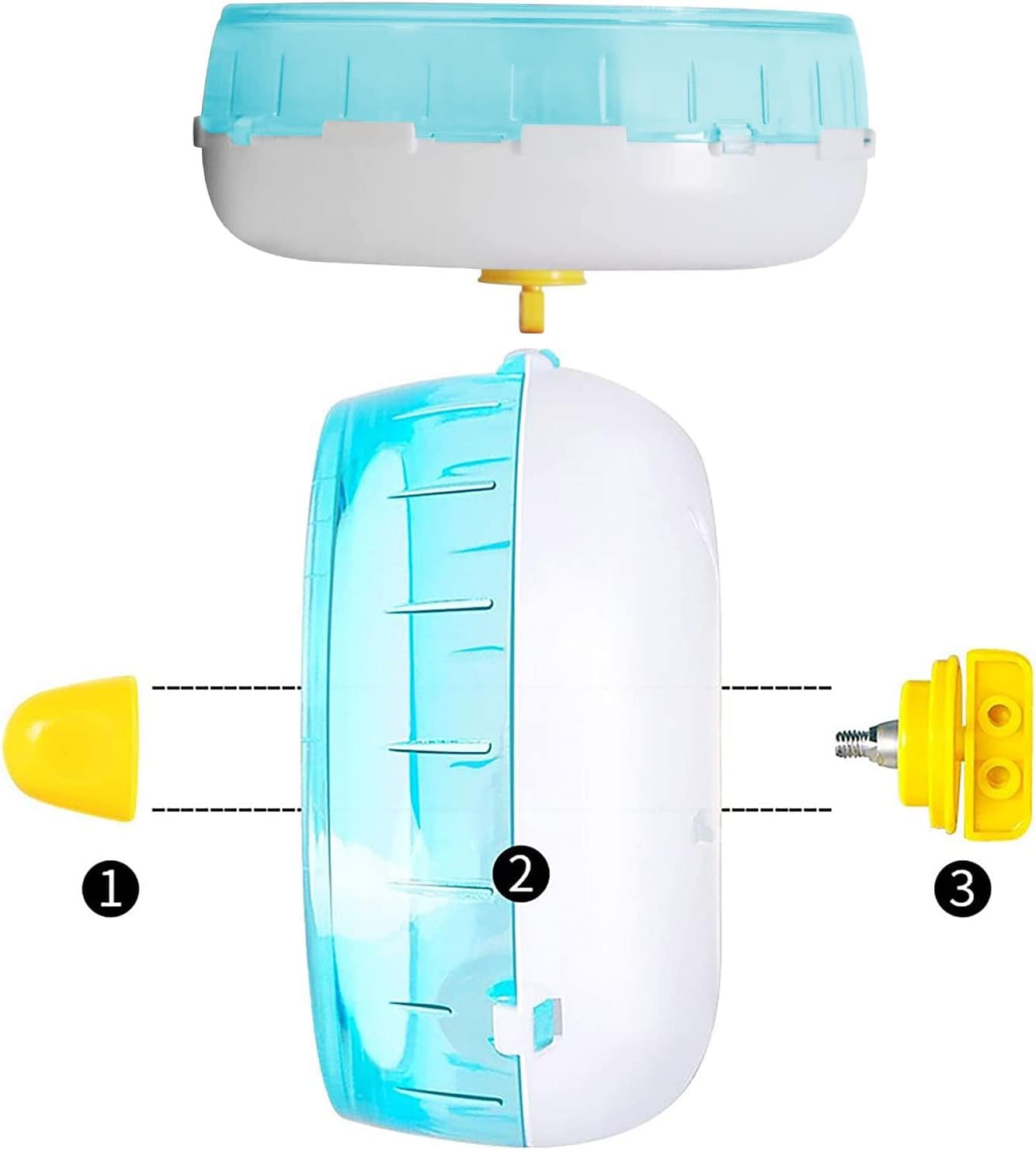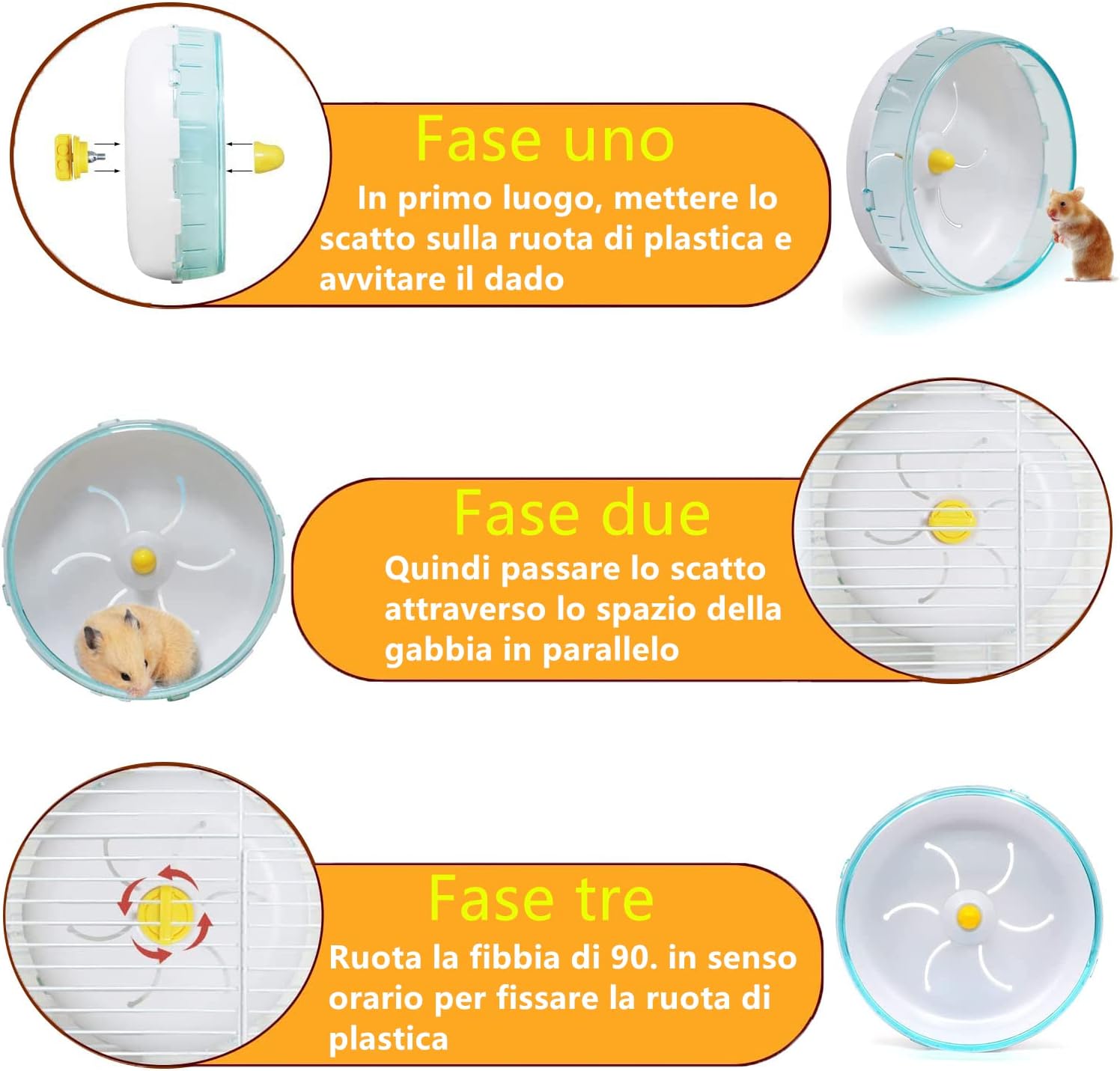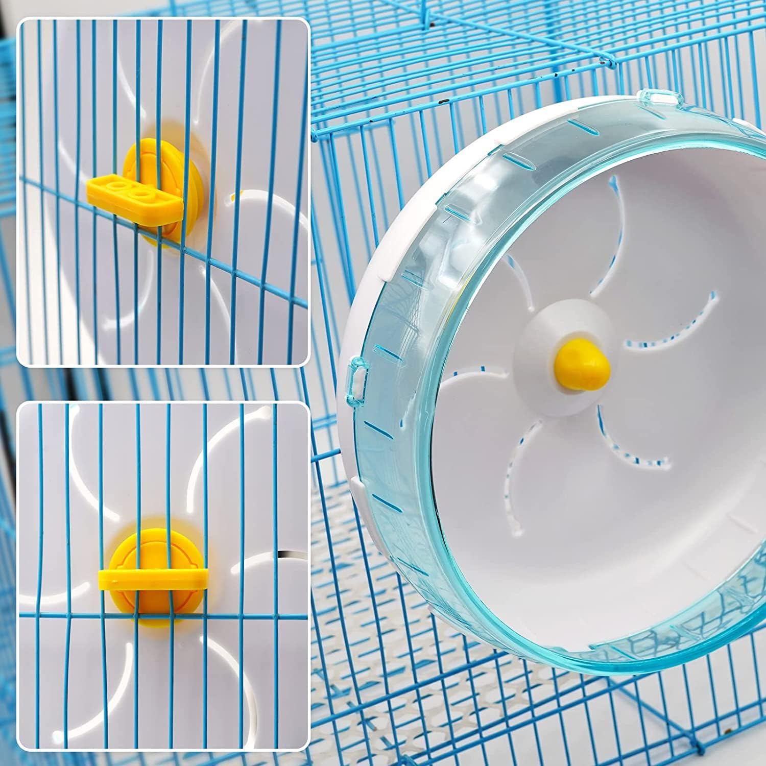 • Лесно за употреба Колелото за хамстери е лесно за монтаж. Затегнете гайката и го окачете на клетката. Закрепва се лесно отстрани на клетката. Лесно се почиства. Малкото колело има прозрачен дизайн, изглежда визуално просторно и светло. Можете лесно да наблюдавате домашния си любимец, докато играе вътре. Издръжливо и стабилно въртене. Заоблените ръбове го правят по-безопасно и по-стабилно.