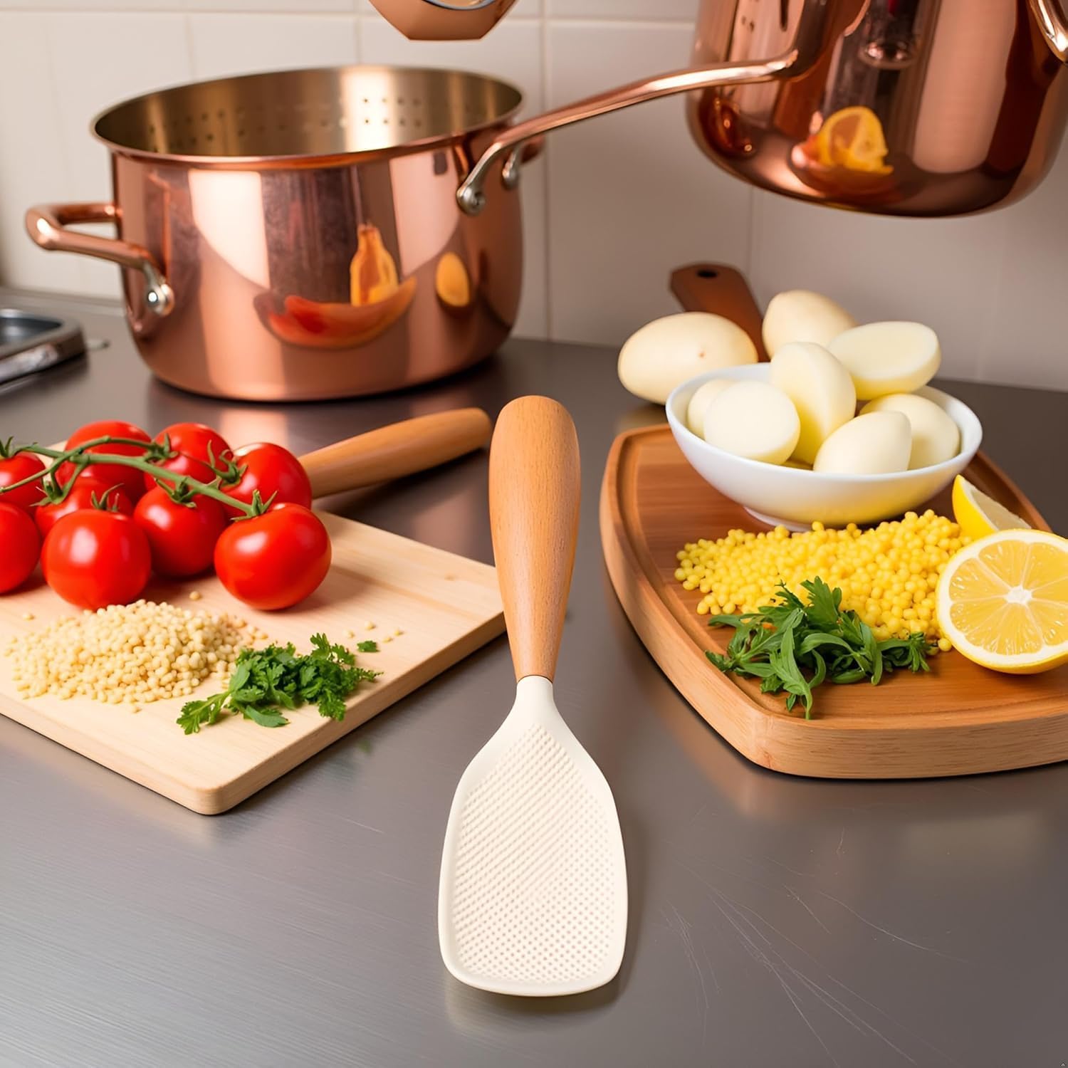 Открийте нашата практична силиконова лъжица за ориз в елегантен бял цвят – перфектният кухненски помощник за ежедневна употреба. Благодарение на иновативния си изправен дизайн, работната ви повърхност остава чиста, тъй като главата на лъжицата не опира директно върху повърхността. Термоустойчивият силикон предпазва ръцете ви от изгаряния при разбъркване на горещи храни. Ергономично проектираната лъжица е идеална за сервиране на ориз, картофи и други гарнитури. Висококачественият силиконов материал е здрав, издръжлив и изключително лесен за почистване. С идеалния си размер и обмислен дизайн, лъжицата пасва удобно в ръката ви и позволява прецизно порциониране. Незаменим кухненски инструмент, който перфектно съчетава функционалност и комфорт.