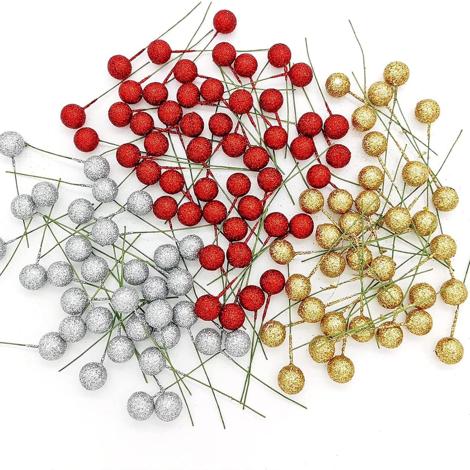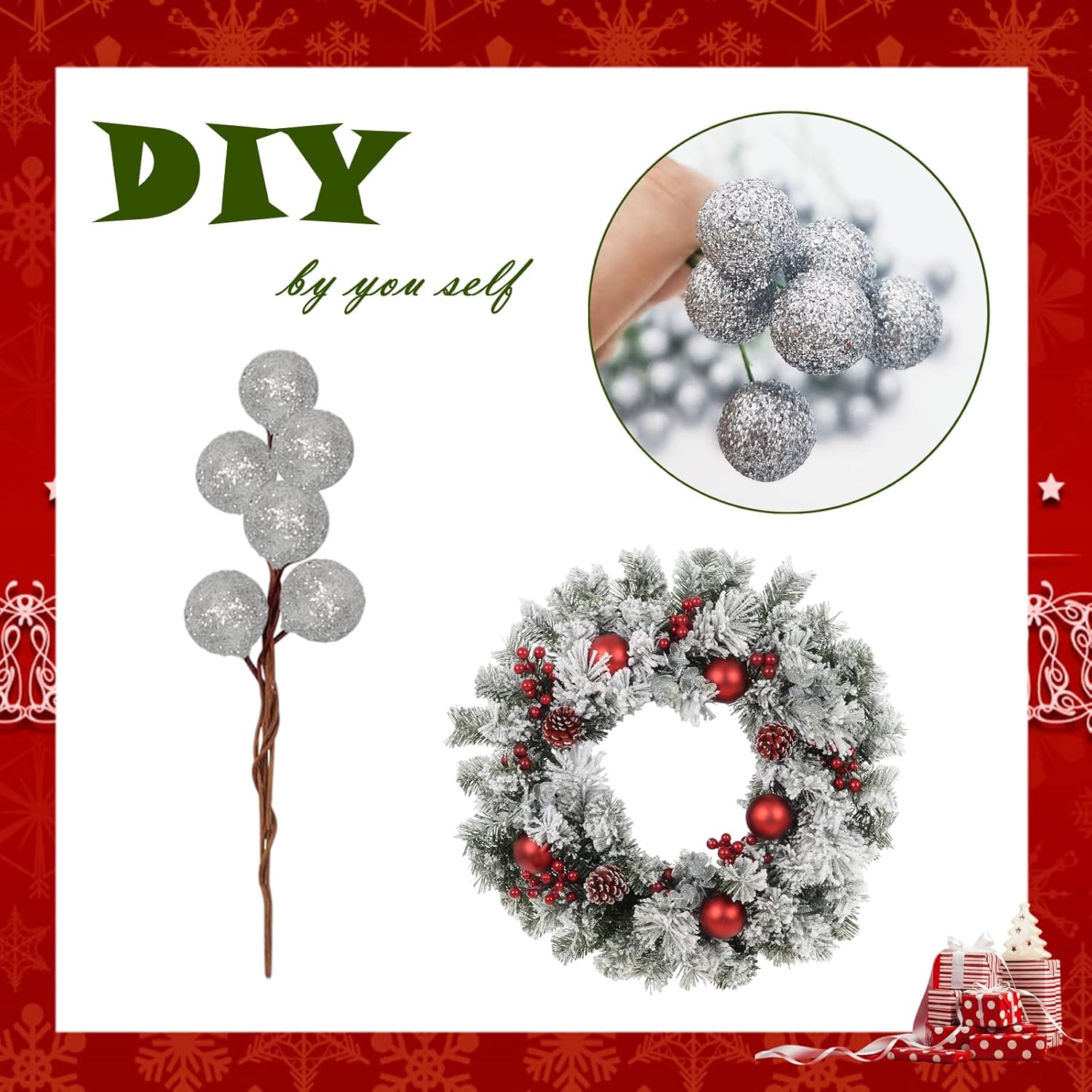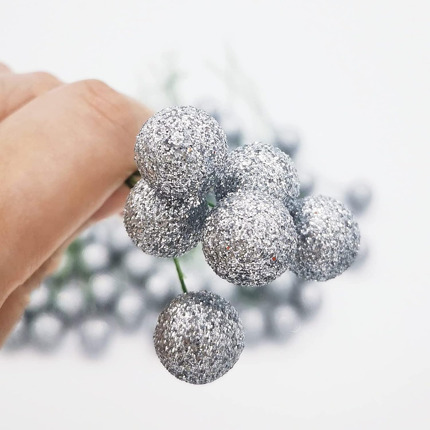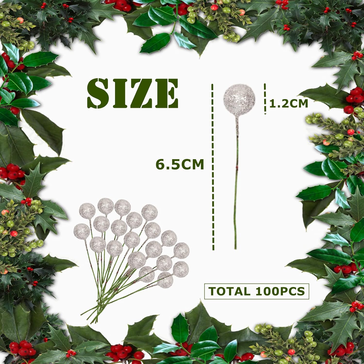 Пакетът включва 100 броя изкуствени сребърни плодове от джел, страхотни коледни декорации за коледно парти. Размерът на всяко шишче с плодове е приблизително 6,5 см дължина, диаметърът на плодовете е 1,2 см. Всички имат тел, клонките на плодовете могат да се огъват произволно, което може лесно да се използва за направата на различни декорации. Високо качество Изкуствените стъбла на плодовете са изработени от висококачествена пяна и тел, фина изработка, издръжлив материал за дълготрайна употреба, леки и не са лесни за избледняване или чупене, за многократна употреба.