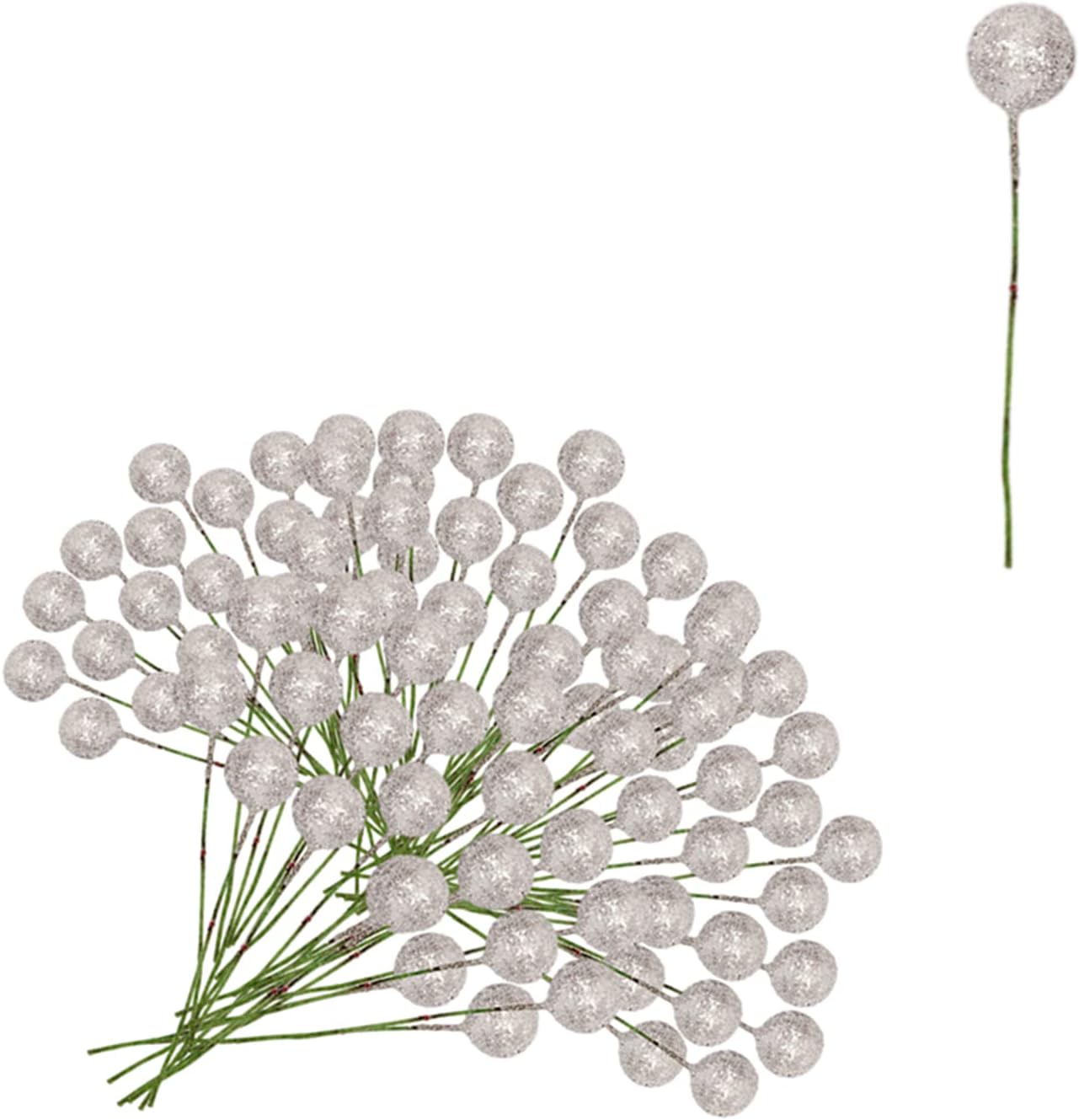 Пакетът включва 100 броя изкуствени сребърни плодове от джел, страхотни коледни декорации за коледно парти. Размерът на всяко шишче с плодове е приблизително 6,5 см дължина, диаметърът на плодовете е 1,2 см. Всички имат тел, клонките на плодовете могат да се огъват произволно, което може лесно да се използва за направата на различни декорации. Високо качество Изкуствените стъбла на плодовете са изработени от висококачествена пяна и тел, фина изработка, издръжлив материал за дълготрайна употреба, леки и не са лесни за избледняване или чупене, за многократна употреба.