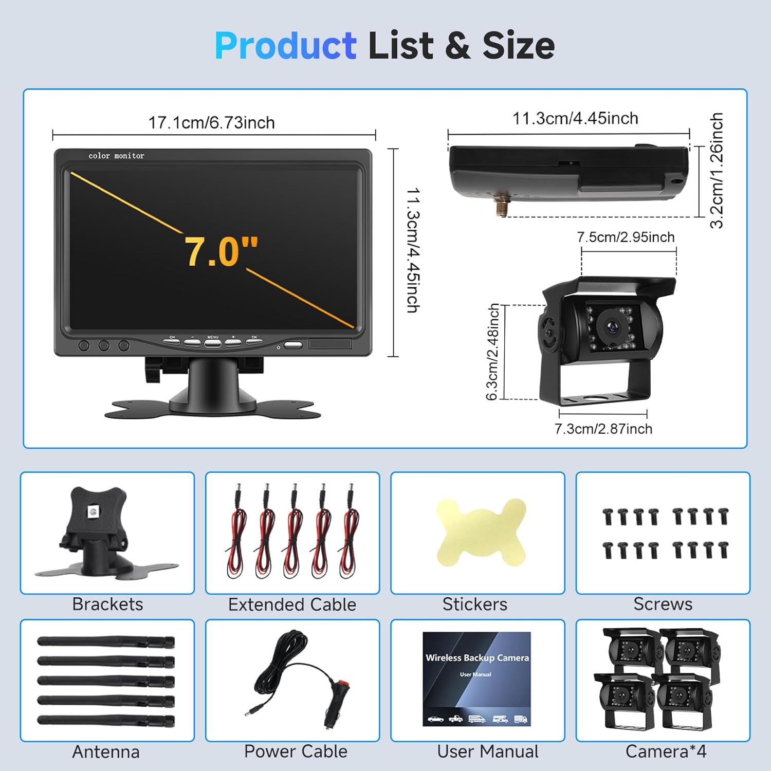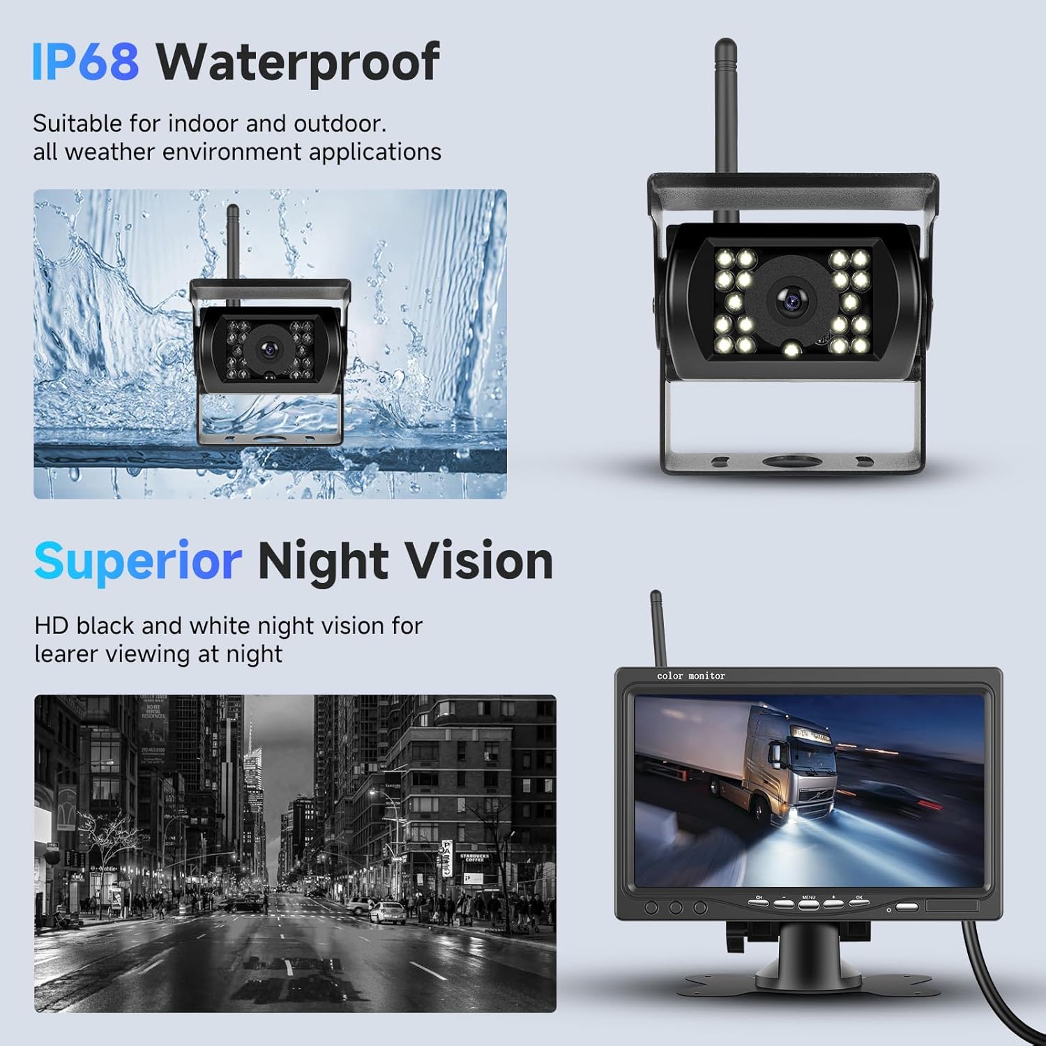 • ►[Подобрен комплект безжична камера за заден ход]: Широко подходящ за ремаркета, кемпери, кемпери, камиони, автомобили и автобуси. Разполага със 7-инчов LCD монитор за ясни изображения от камерата. Лесен за инсталиране; мониторът и камерата просто се нуждаят от отделни захранвания.