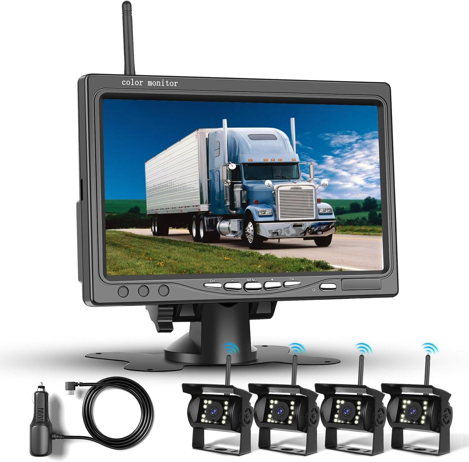 1080P HD Безжичен комплект за четири камери за заден ход, 7-инчов LCD монитор с 4 камери за заден ход за ремаркета, кемпери, камиони, автомобили, автобуси, DIY насочващи линии, IP68 водоустойчивост, нощно виждане, BSD, 12V-36V