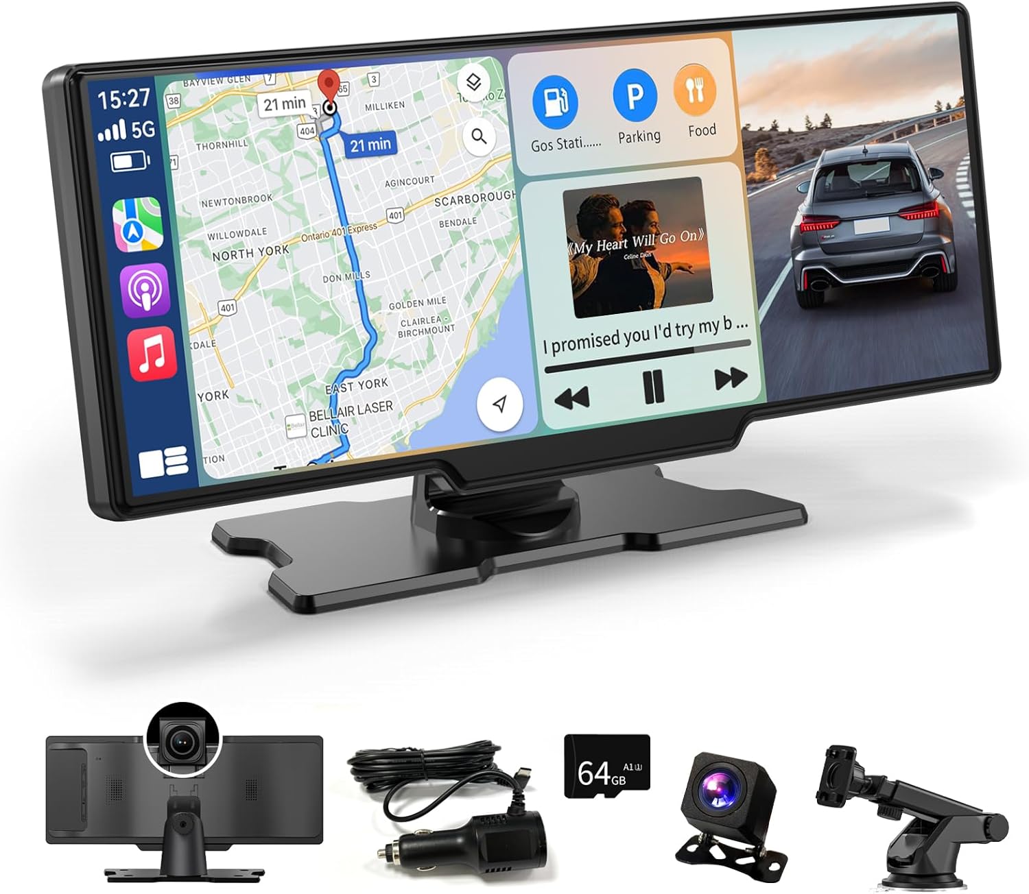 • Безжичен CarPlay и Android Auto: Просто свържете преносимия CarPlay екран към вашия смартфон и можете лесно да използвате гласовото управление Siri, за да осъществявате/приемате разговори със свободни ръце, да слушате любимата си музика, да навигирате и други. С AirPlay и Android Cast можете безпроблемно да свържете и синхронизирате цялото съдържание на вашия смартфон, включително видеоклипове и филми, към IPS сензорния екран с висока резолюция на Apple/Android Auto CarPlay, обогатявайки шофирането ви с аудиовизуално забавление.