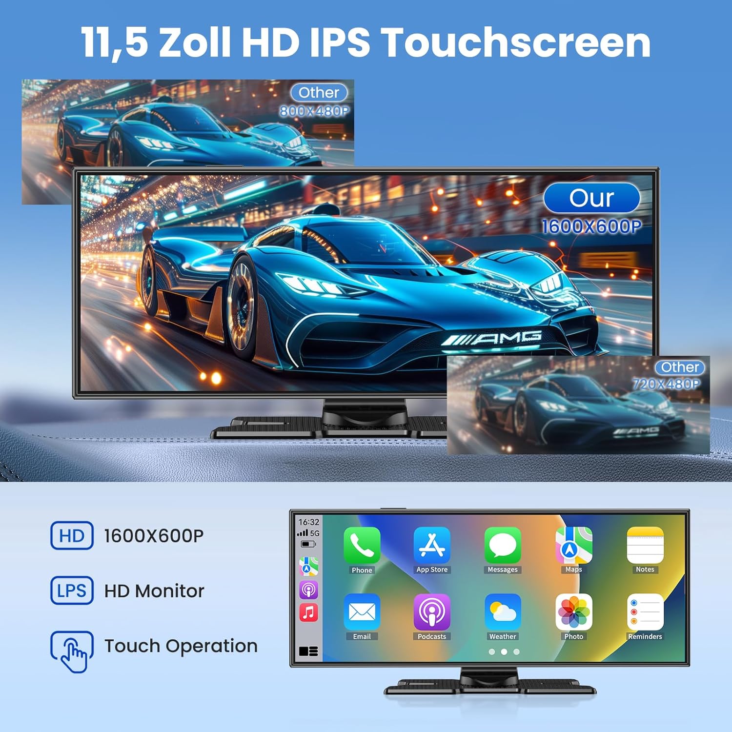 • Ексклузивен 11,5-инчов CarPlay дисплей: 11,5-инчовият Apple CarPlay екран за автомобили е съвместим с CarPlay и Android Auto. Най-големият сензорен екран на пазара, той предлага по-голяма яснота за подобрено видео изживяване. Екранът CarPlay решава и проблема с ограничената видимост на водача, което го прави по-безопасен за използване.