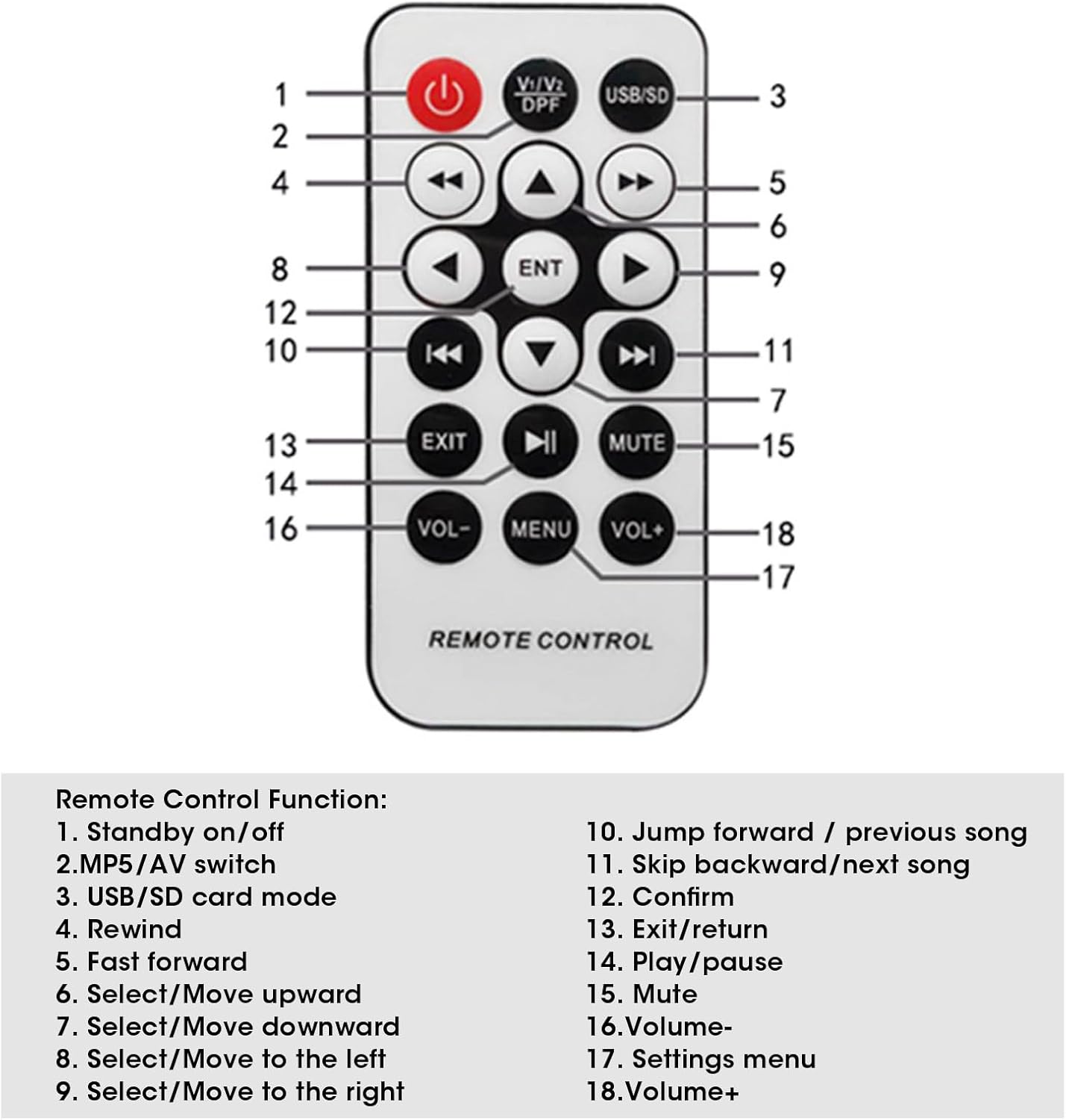 [Breite Kompatibilität] – Spielen Sie verschiedene Medienformate ab, darunter MP3, MP4, WMA, WAV, MPEG2, MPEG4 und mehr. Ausgestattet mit integrierten Lautsprechern, integriertem FM-Transmitter und Unterstützung für USB-, SD- und -Eingang mit HD 1080P-Unterstützung.