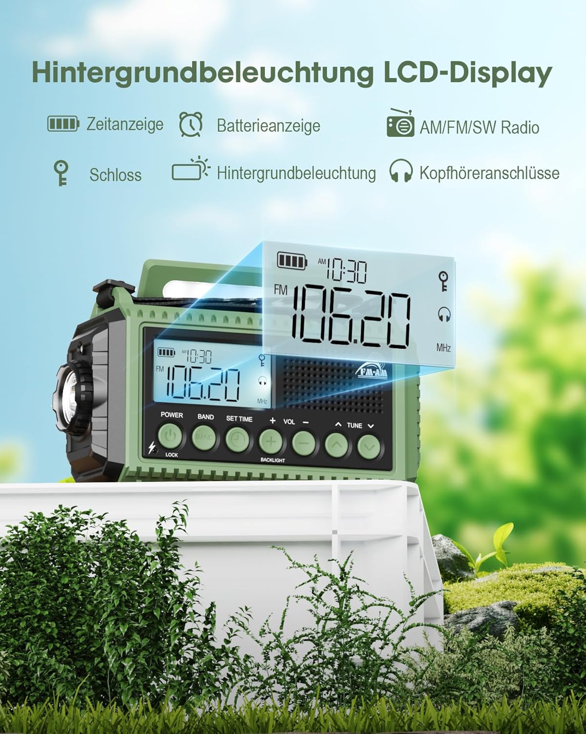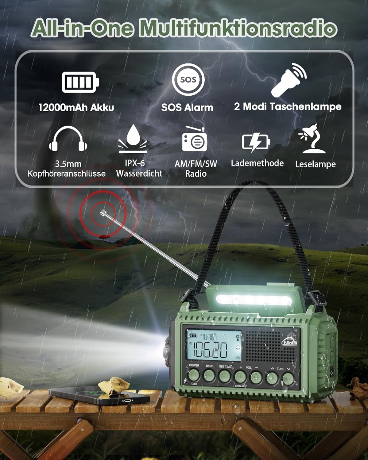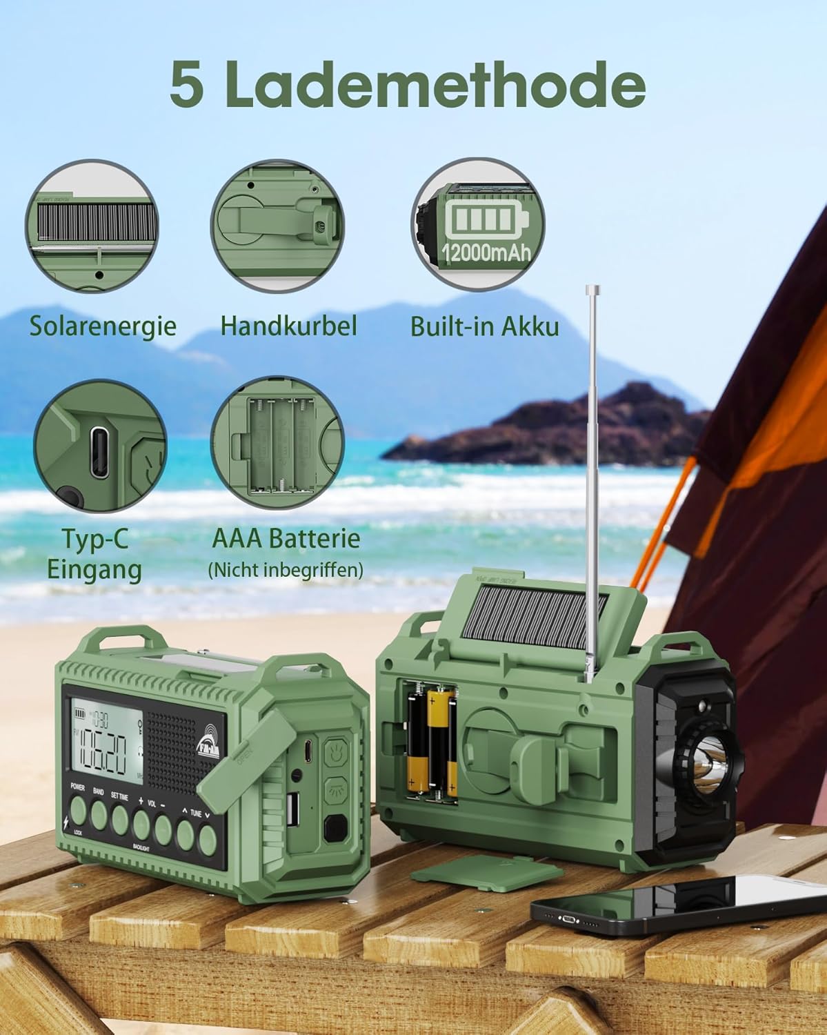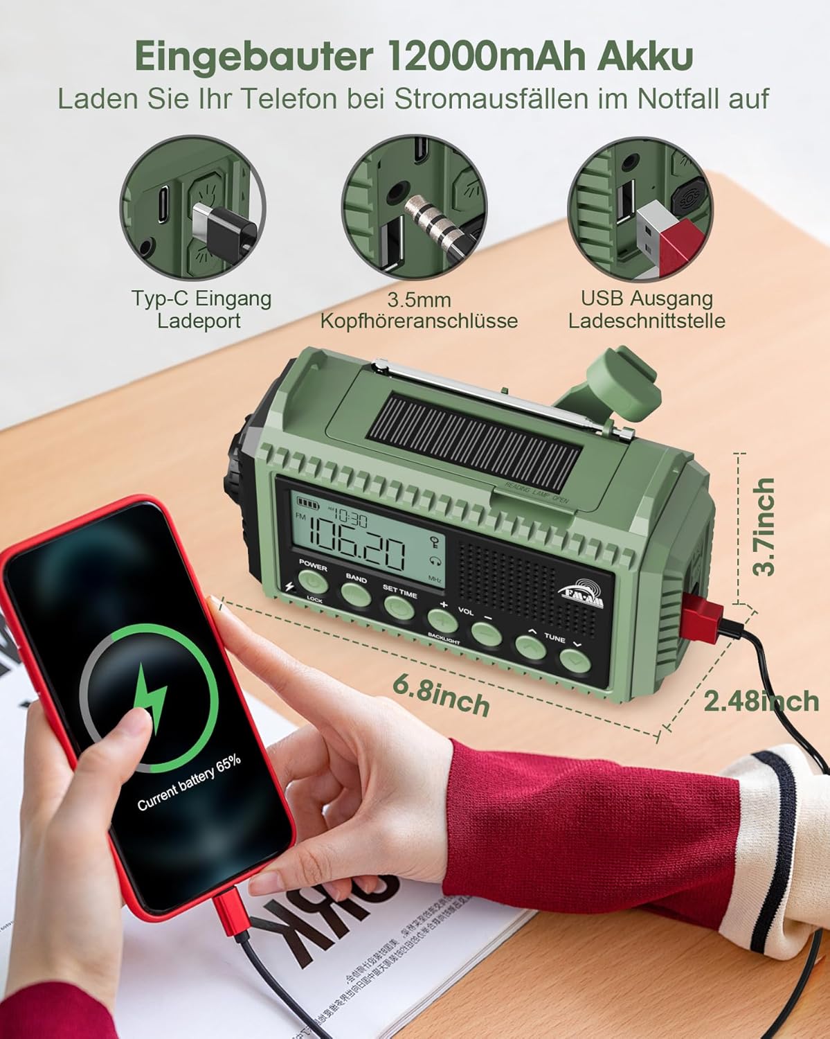 • Независимо дали сте на къмпинг, на туризъм или се сблъсквате с неочаквани кризи, нашето компактно аварийно радио с капацитет 12 000 mAh гарантира несравнима готовност за употреба. С 2,4 пъти по-голям капацитет на батерията от конвенционалните аварийни радиостанции и разнообразни опции за зареждане, то гарантира надеждност в критични моменти.