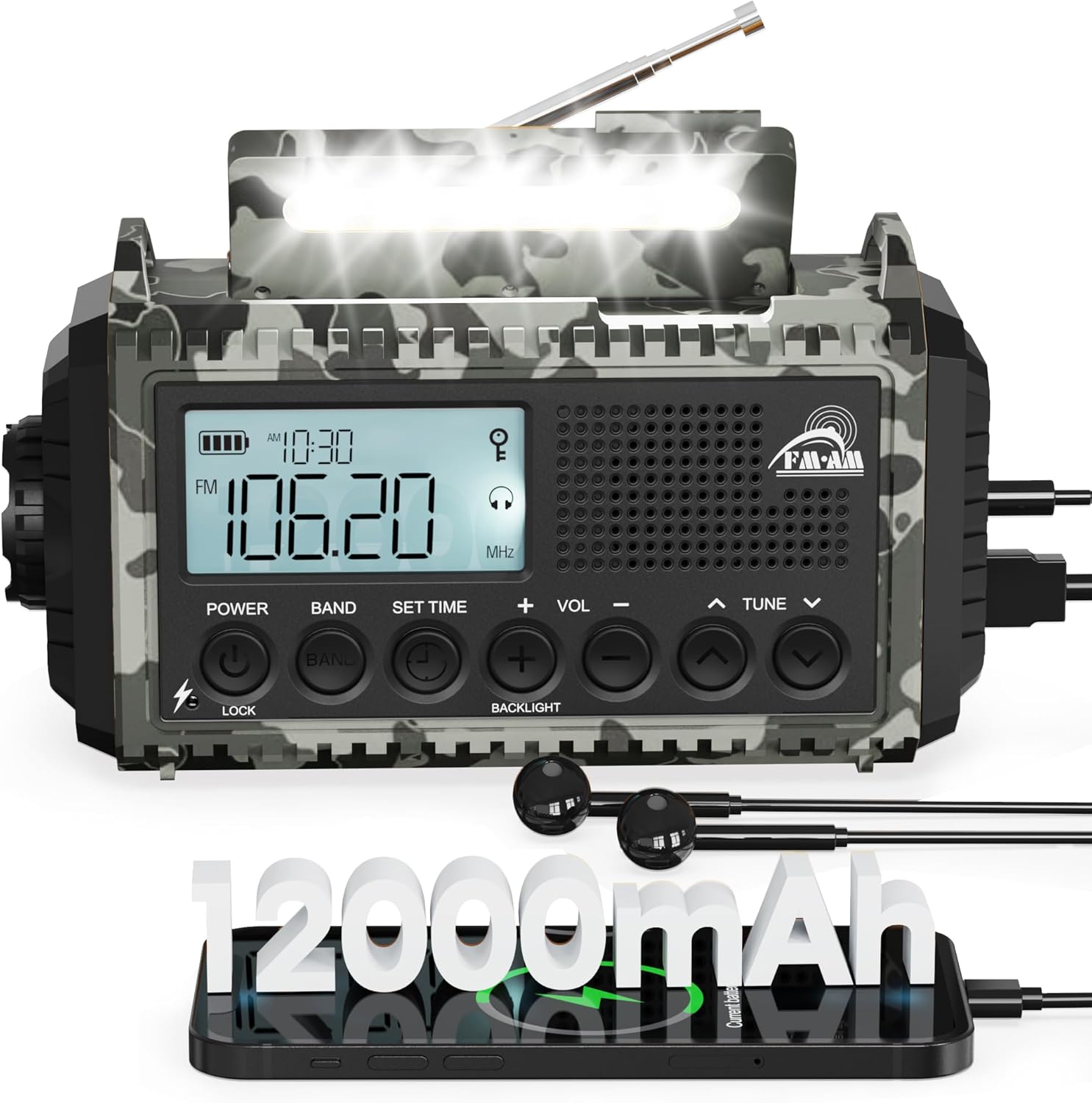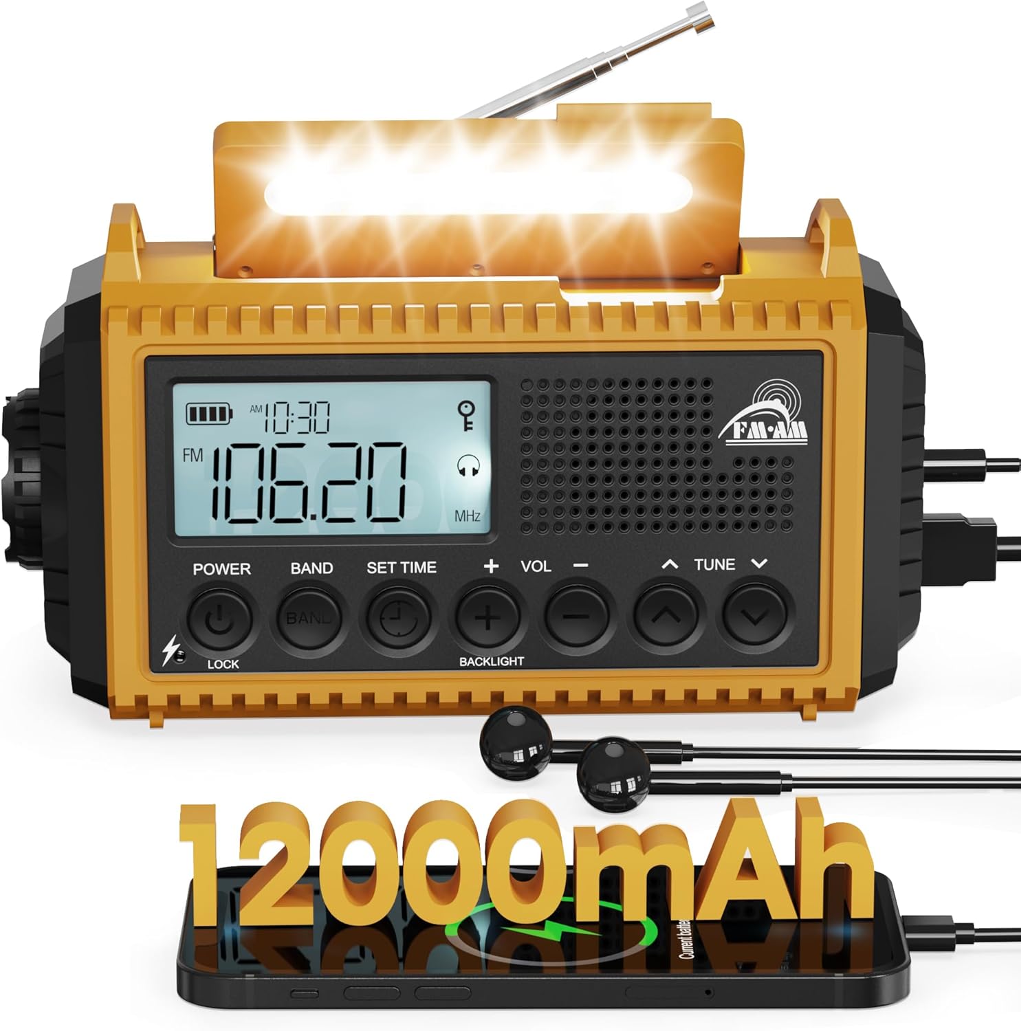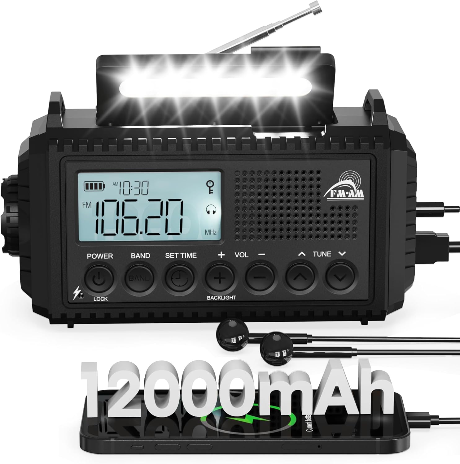 • 【Лесен за инсталиране】 Това аварийно радио има вградена батерия от 12000 mAh и предлага множество опции за зареждане: соларен панел, ръчна манивела и включения USB кабел. Освен това е оборудвано с отделение за батерии за аварийни ситуации (3 AAA батерии, не са включени). LCD екранът показва текущото ниво на зареждане в реално време, така че винаги сте информирани. Когато е напълно заредено, радиото може да възпроизвежда FM радио непрекъснато до 30 часа. Кажете сбогом на внезапните прекъсвания на захранването и винаги бъдете свързани, когато имате най-голяма нужда от него.