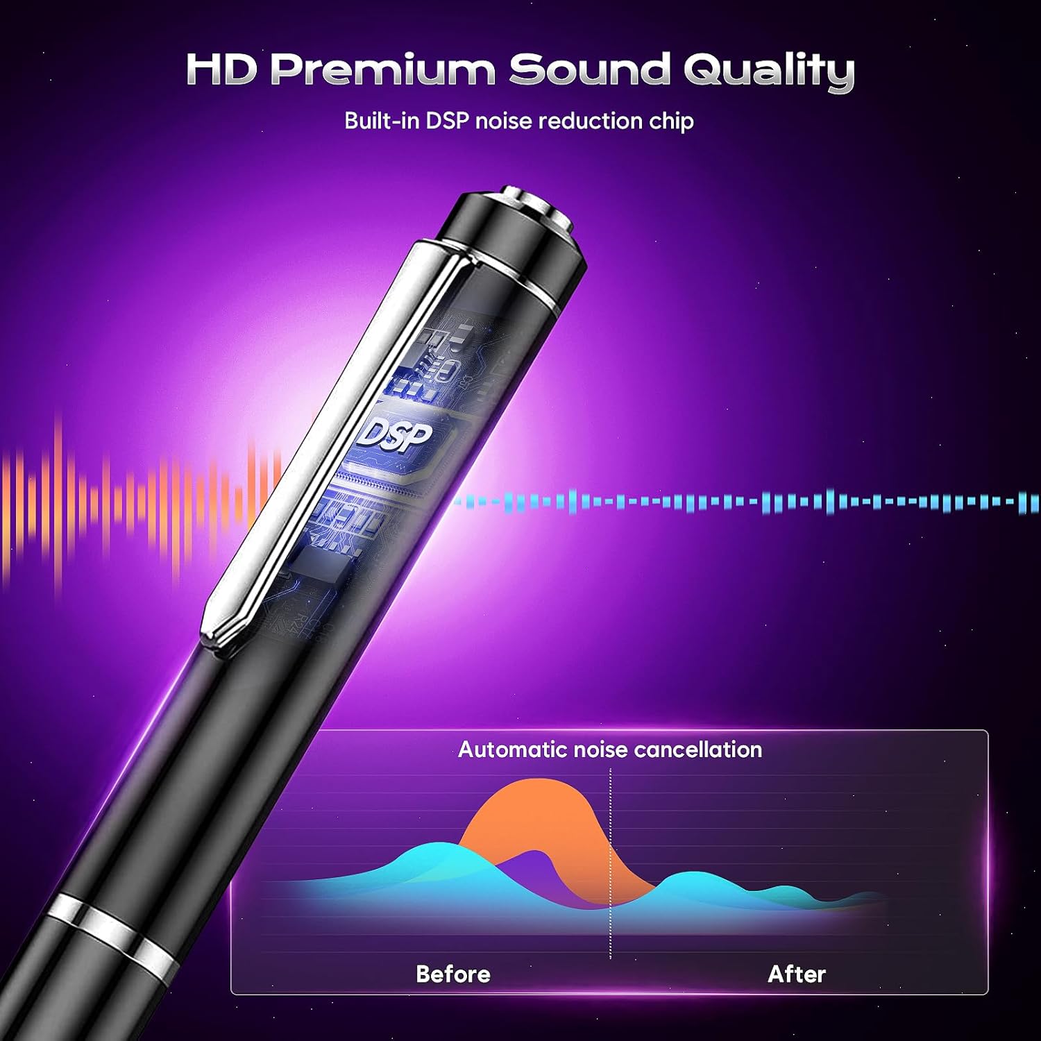• 1536Kbs запис с висока разделителна способност: оборудван с най-новата технология за цифрова обработка на сигнала (DSP), мощният чип интелигентно потиска смущенията, осигурявайки висококачествени записи с ясно и детайлно възпроизвеждане на звука.