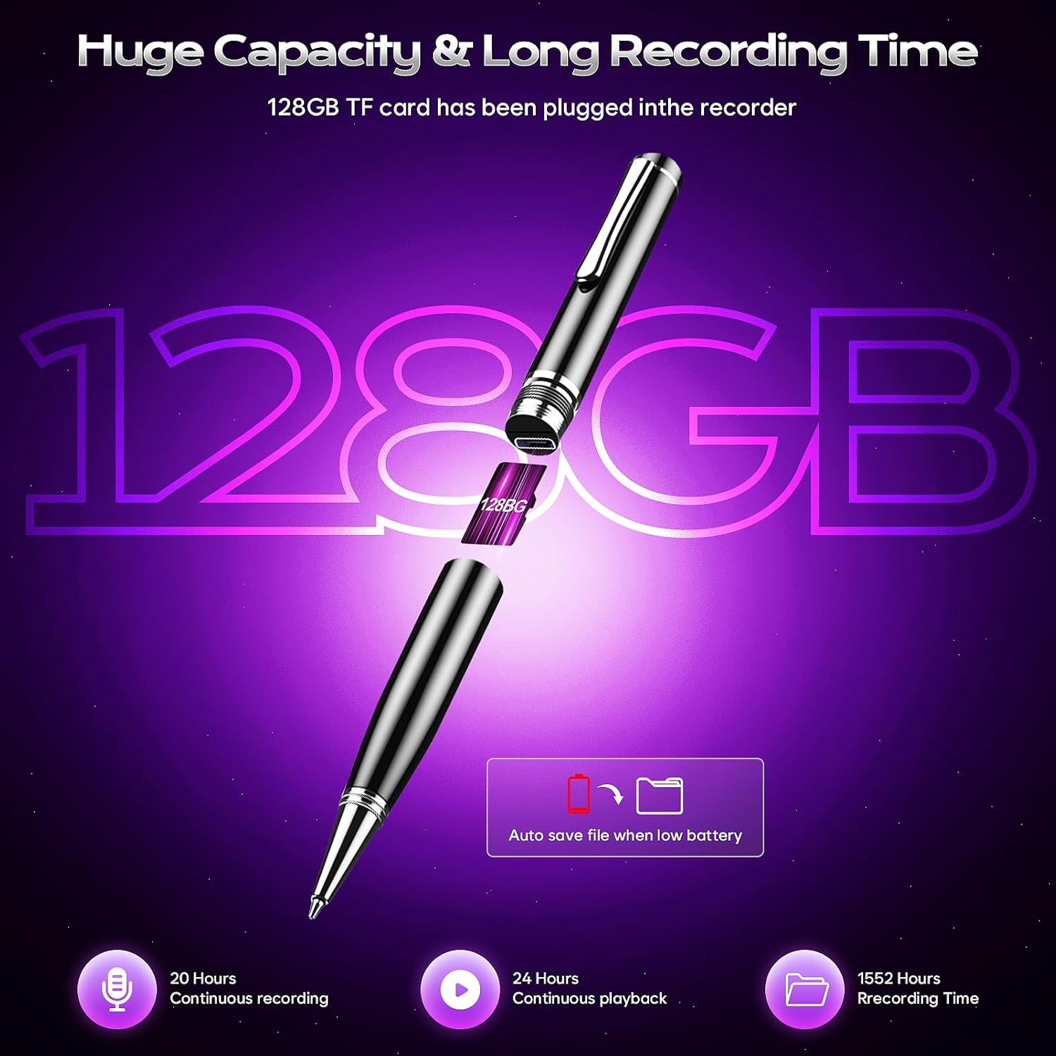 • 64GB капацитет за съхранение и дълготрайна батерия: Новообновеният рекордер поддържа сменяема 64GB TF карта, която може да съхранява до 2400 часа записи. Вградената висококачествена батерия се зарежда напълно само за 1,5 часа и позволява до 20 часа непрекъснат запис.