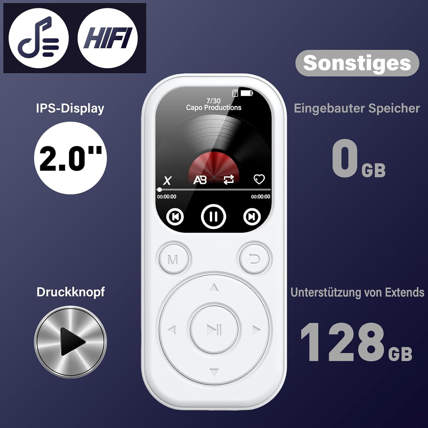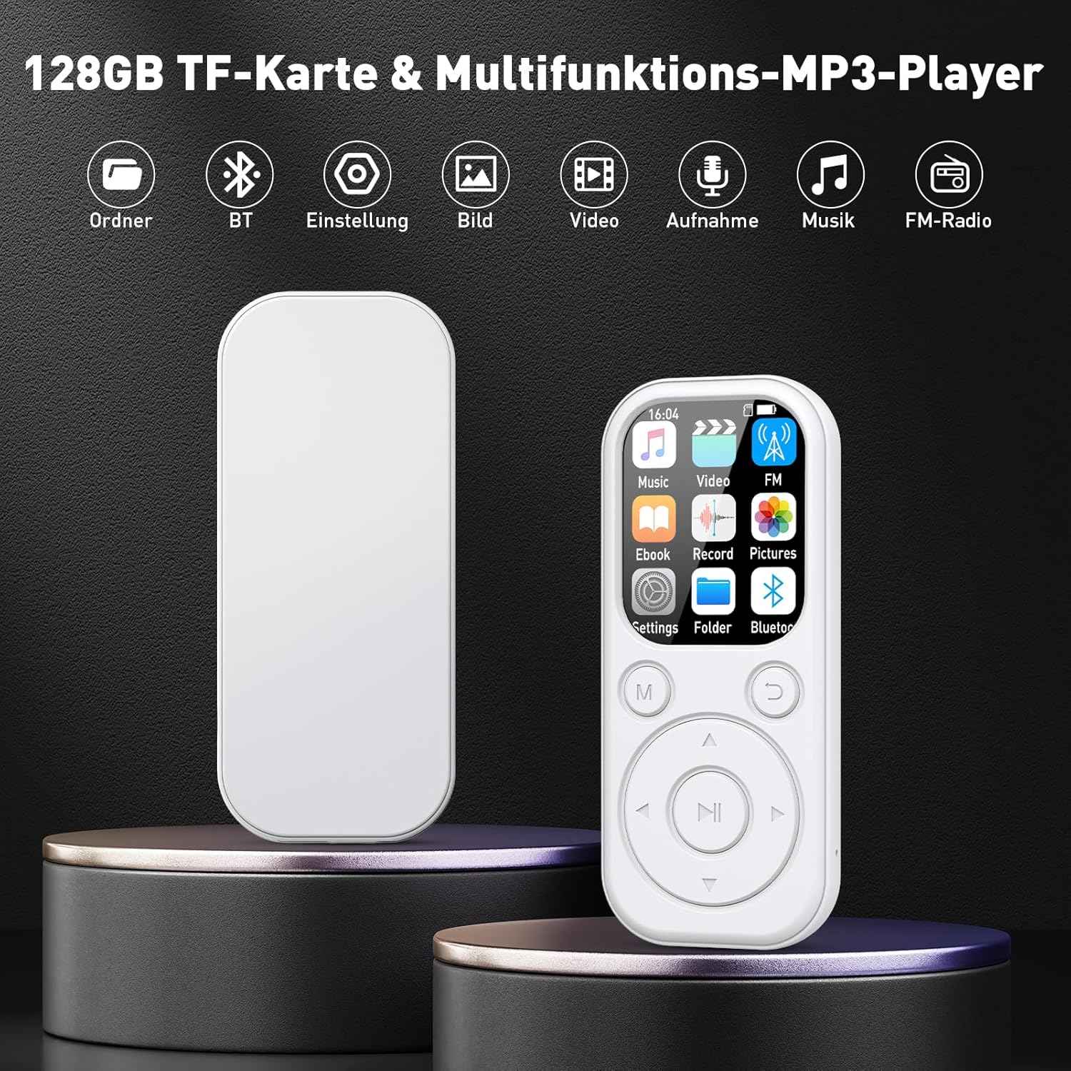 128GB MP3 плейър Bluetooth, RWSRW MP3 плейър със слушалки FM радио диктофон мини дизайн HiFi звук четец за електронни книги фотоалбум идеален за спорт, бял