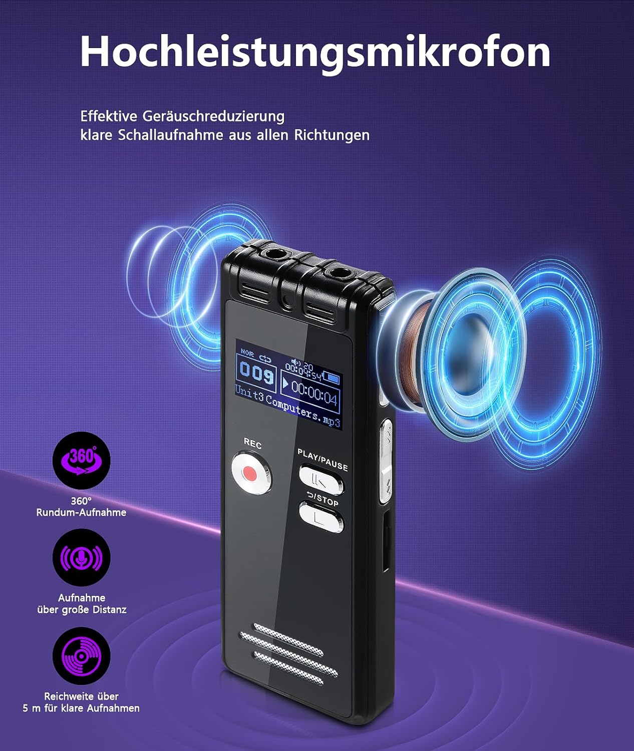 • 【DSP намаляване на шума и високопроизводителен микрофон】- Рекордерът NekSide използва 2 всепосочни високопроизводителни микрофона, 360° съраунд звукозаписни устройства и 18-метров запис на живо. Оборудван е с мощен ANC чип и технология за цифрова обработка на сигнала (DSP), като максималната поддържана битрейт е 3072 kbps, което позволява интелигентно шумопотискане, така че можете да записвате и възпроизвеждате висококачествени записи ясно.