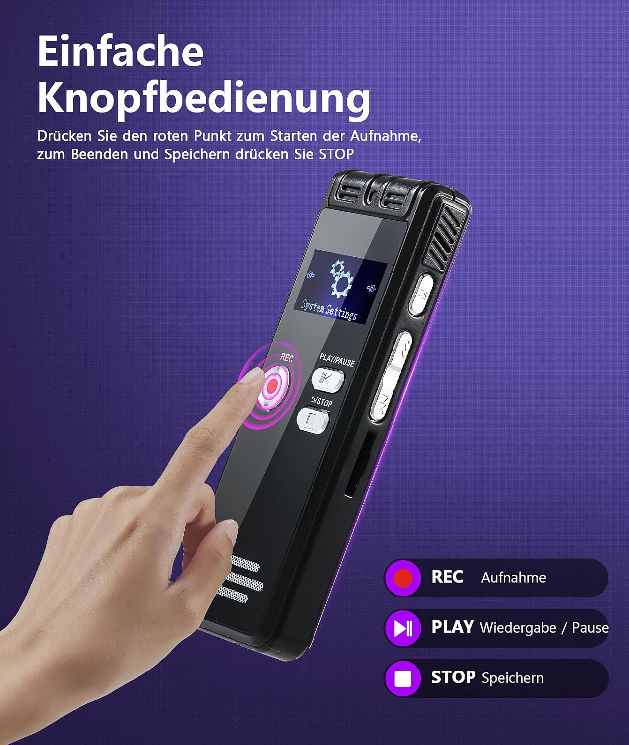• Малък и мощен: записващото устройство е с размери само 9 x 3,2 x 1,5 см и тежи приблизително 56 г. С внимателно изработен метален корпус, цифровият рекордер NekSide е по-малък от обикновена запалка и се побира лесно в дамска чанта или джоб. Това го прави перфектен подарък за студенти, адвокати, бизнесмени, учители и др. Записвайте всички важни мисли, събирайте доказателства или документирайте консултации с лекар. Много полезен във всички ежедневни ситуации.