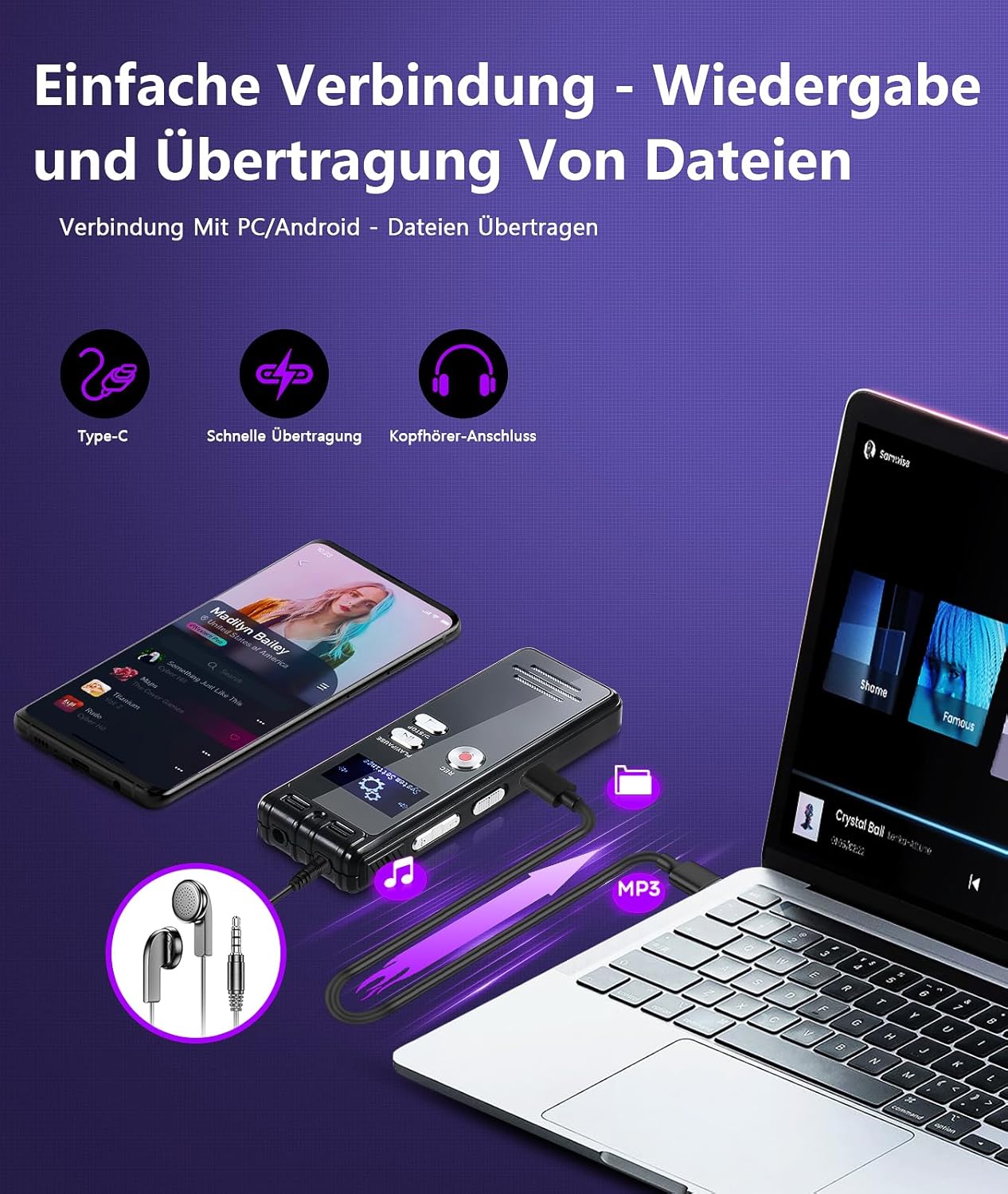 128GB NekSide гласов рекордер, касетофон с интерфейс Type-C, запис с едно докосване на MP3, 3072kbps цифров гласов рекордер, HD устройство за запис с два микрофона за лекции, срещи, интервюта