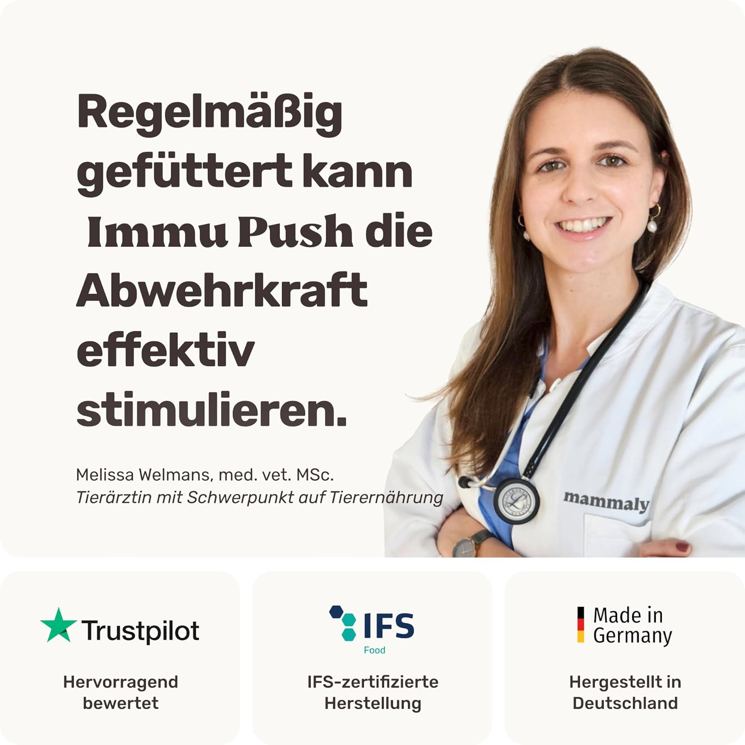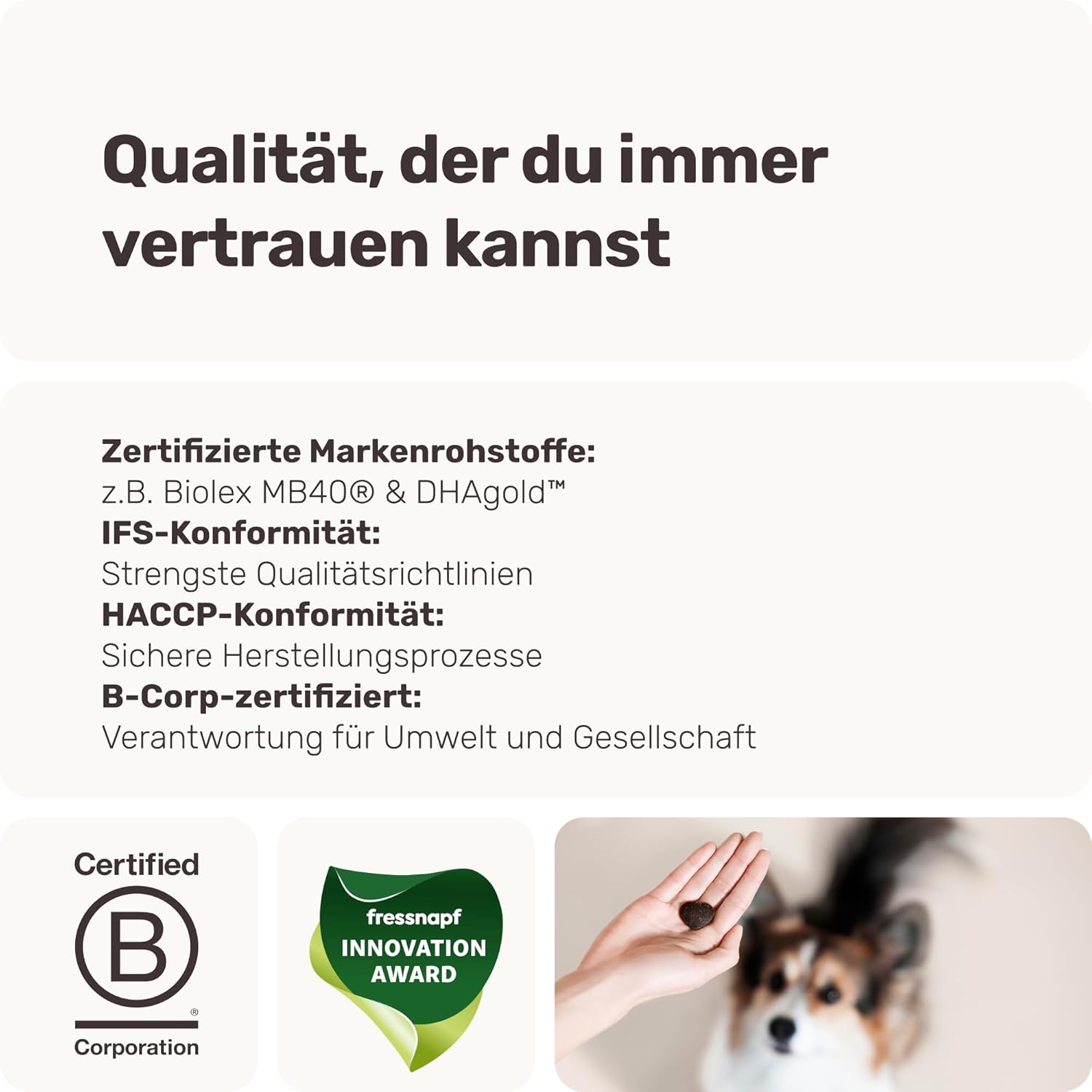 Състав: Ориз, растителен глицерин, хидролизиран пилешки дроб 6,0%, птича мазнина, нар 3,0%, шипка 3,0%, бирена мая 2,1%, омега-3 (от ленено масло), червена боровинка 2,0%, спирулина 2,0%, морков, целина, цвекло, тиквички, тиква, бета-глюкан 0,4%, инулин 0,3%, MOS 0,3%, FOS 0,3%. Хранителни добавки: Витамин B1 3359 mg/kg, Витамин E 1509 mg/kg, цинк като цинков оксид 583 mg/kg (Зоотехнически добавки: стабилизатор на чревната флора Enterococcus faecium (DSM 10663 NCIMB 10415 / 4b1707) 8,0 x 10^10 CFU/kg). Аналитични съставки: Суров протеин 9,3%, сурови мазнини 5,8%, сурова пепел 2,8%, сурови влакнини 2,2%, влага 27,4%