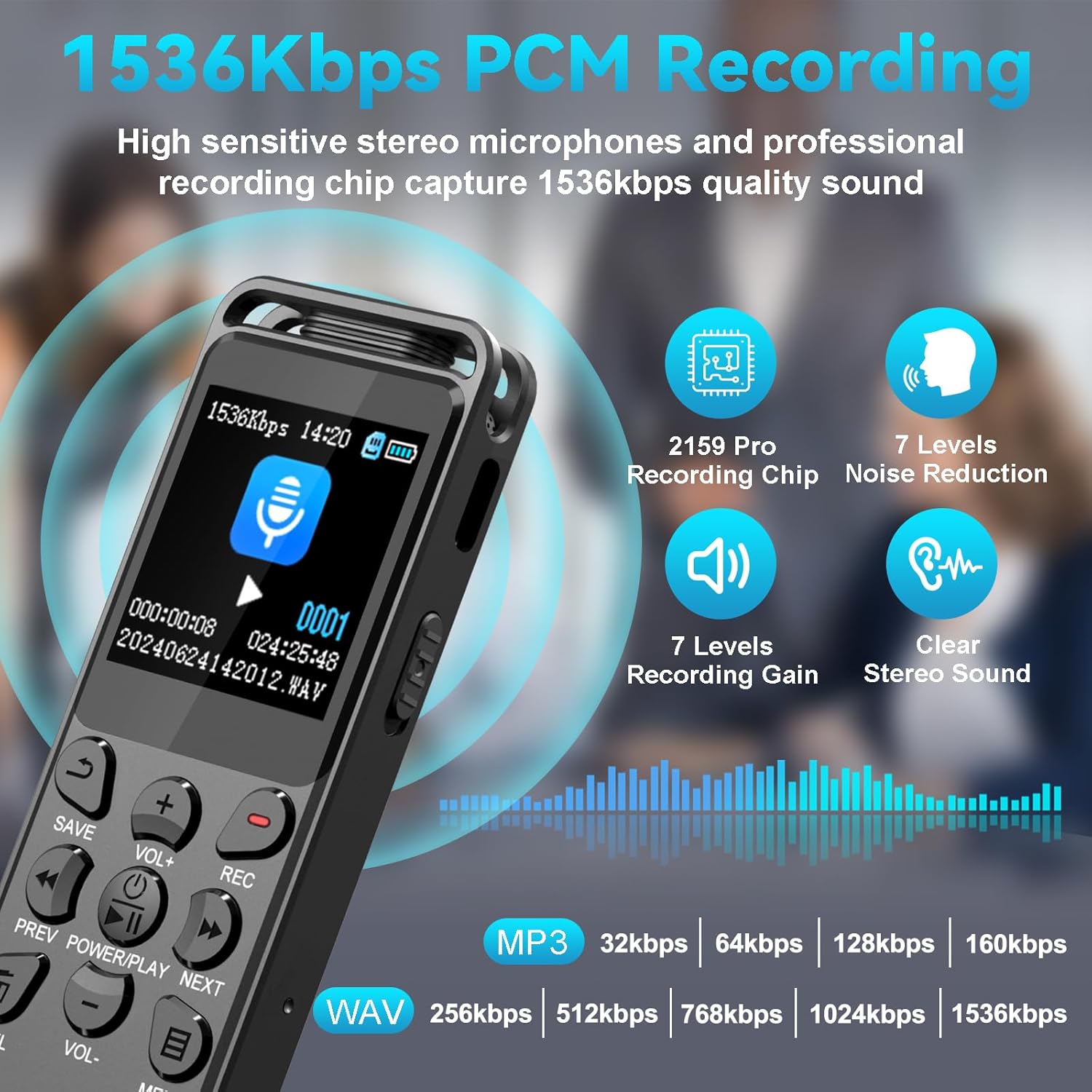 • 1536Kbps ясен запис: Вграден професионален чип за запис 2159, с DSP 7-степенна интелигентна технология за намаляване на шума и 7-степенно усилване на записа, записът е по-ясен и може да възпроизведе гласа на записвания обект по-реалистично. 2 формата за запис, от които да избирате, MP3: 32~160Kbps, WAV: 256~1536Kbps, за да ви предостави разнообразие от опции за запис.