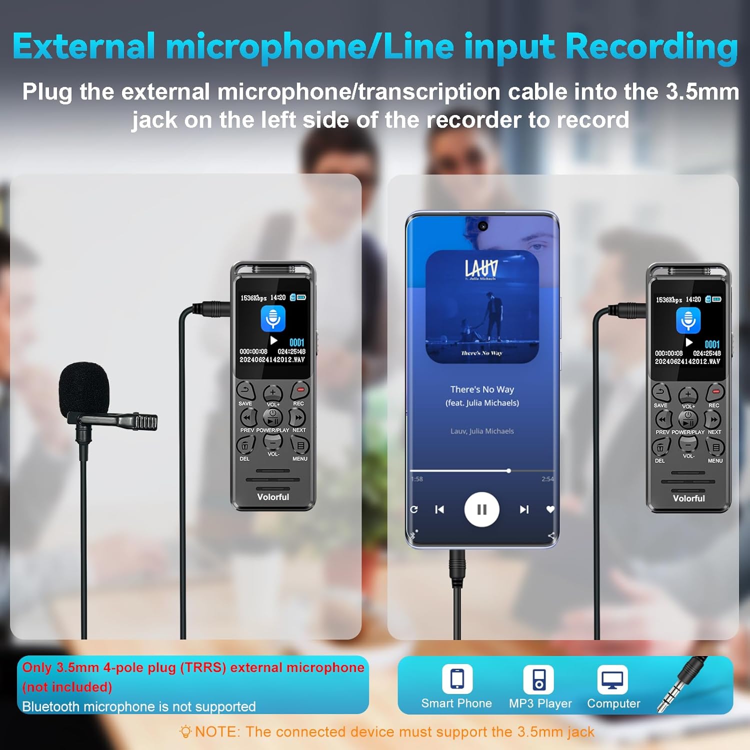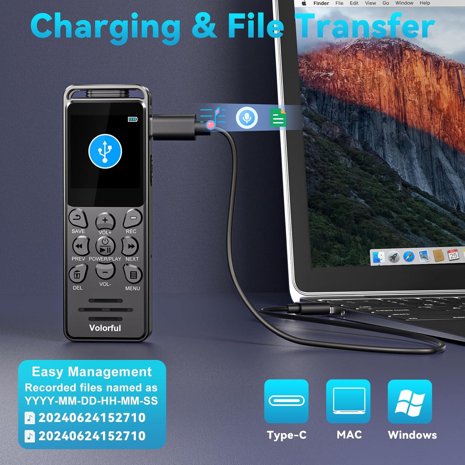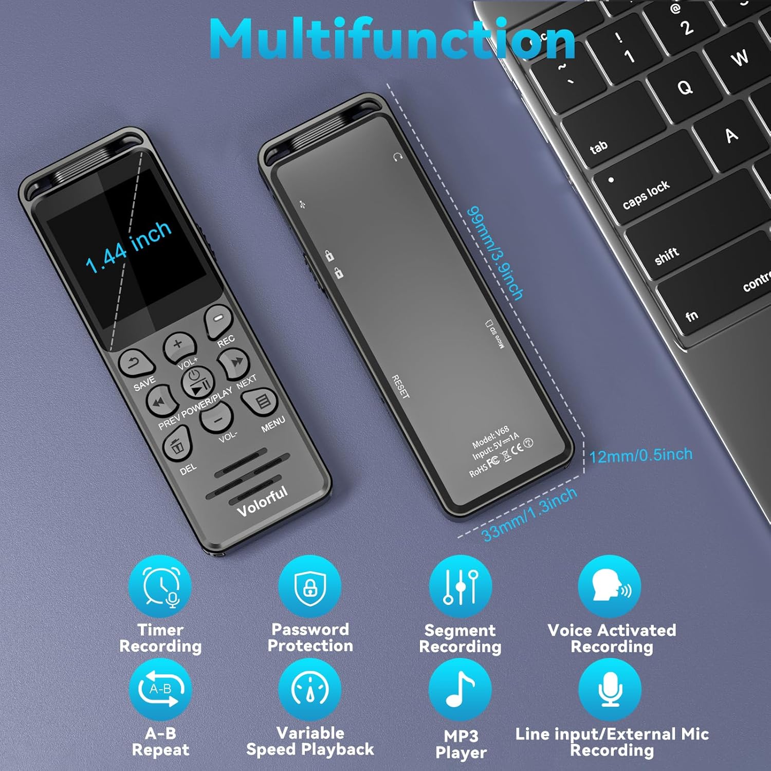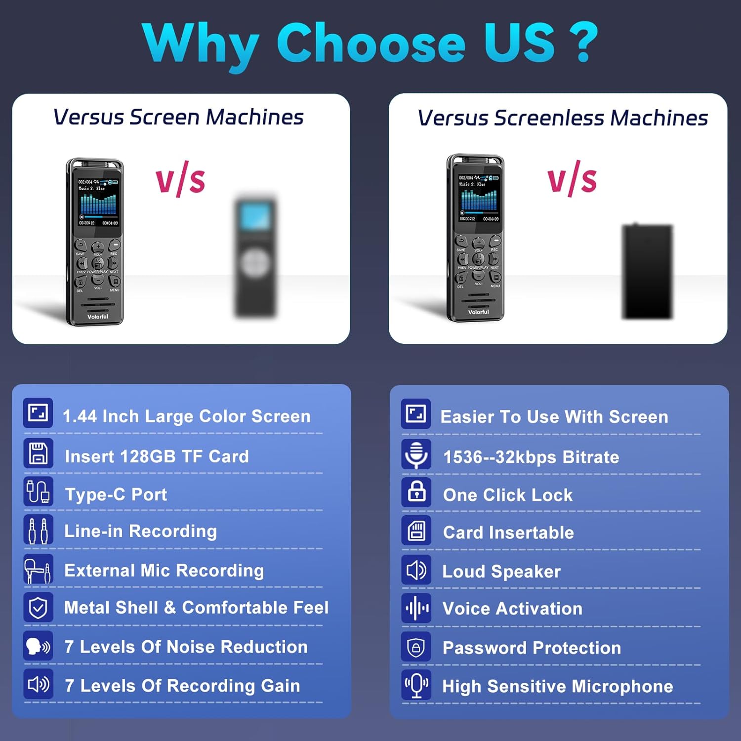 • Защо да изберете диктофон Volorful: В сравнение с други диктофони: поставяне на карта, гъвкаво пространство за разширение; 144GB памет, по-голямо пространство за съхранение; 1,44-инчов голям цветен екран, ясен и лесен за разбиране текст; USB-C порт, по-добра съвместимост; богат набор от аксесоари, по-лесен за употреба. В сравнение с мобилни телефони: 70 часа живот на батерията без прекъсване на записа, без да се нарушава от входящи повиквания, известия, текстови съобщения и др.