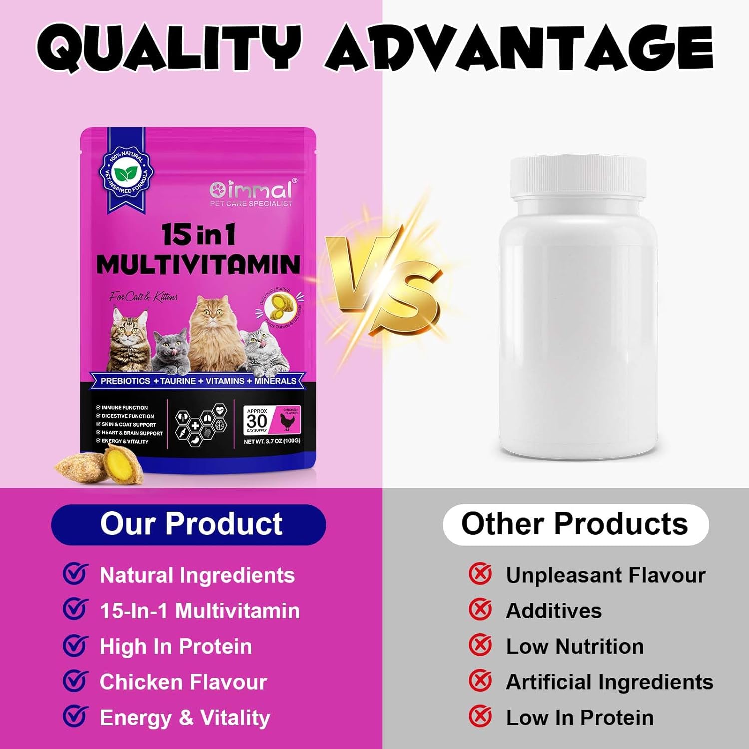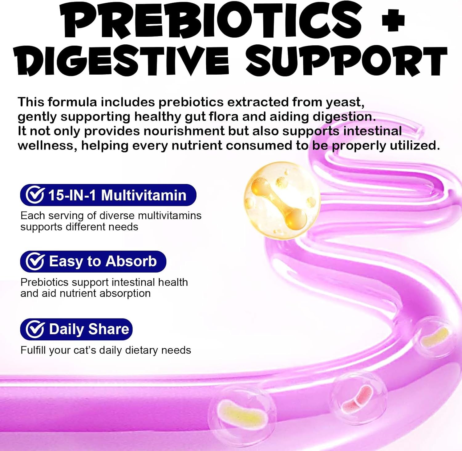 • 【15-в-1 Мултивитаминен комплекс за ежедневно благополучие】Тази цялостна формула съчетава 15 основни витамина, минерала и хранителни вещества, включително ключови съставки като таурин, омега мастни киселини и пребиотици. Съставът на хранителните вещества е създаден да допринесе за цялостното благополучие на вашата котка и да поддържа нормални функции като имунната система, храносмилането, кожата и козината, сърцето и мозъка, както и ежедневната жизненост.