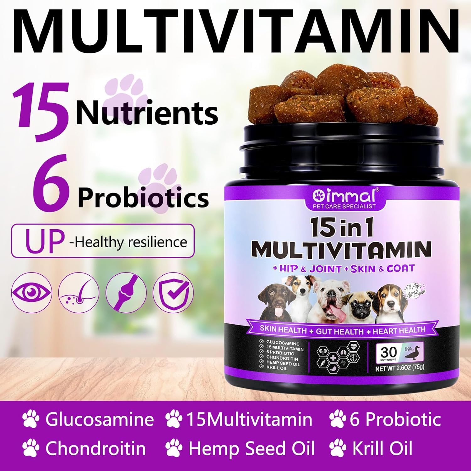 15 в 1 мултивитаминни лакомства за кучета, за подпомагане на здравето - кожа, бедра и стави, чревно здраве, мултивитаминни дъвчащи таблетки за кучета от всички породи (30 дъвчащи таблетки с вкус на пате)