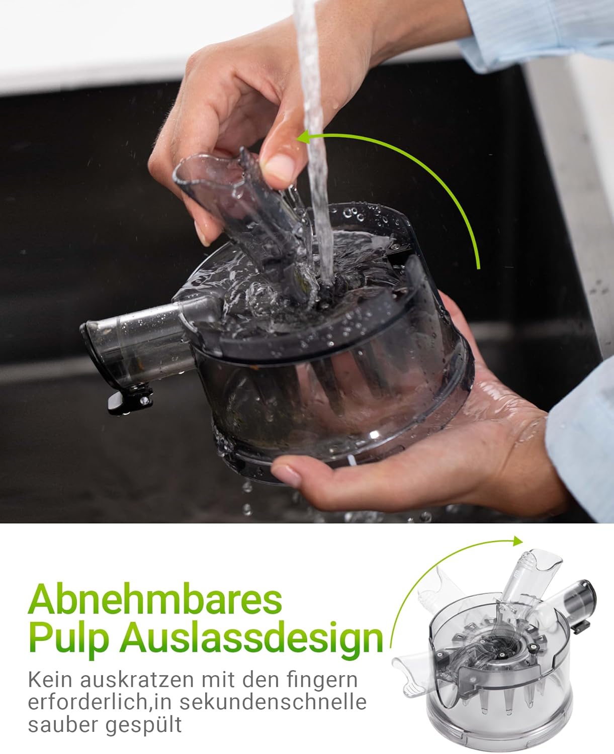 • Патентована система за промиване за 60 секунди. : Въртящ се на 120° изход за люспи + освобождаване с 1 бутон (натиснете бутона → "ЩРАК!" → контейнерът се разтваря). Всички подвижни части (без блока на двигателя!) Изплакнете под вода