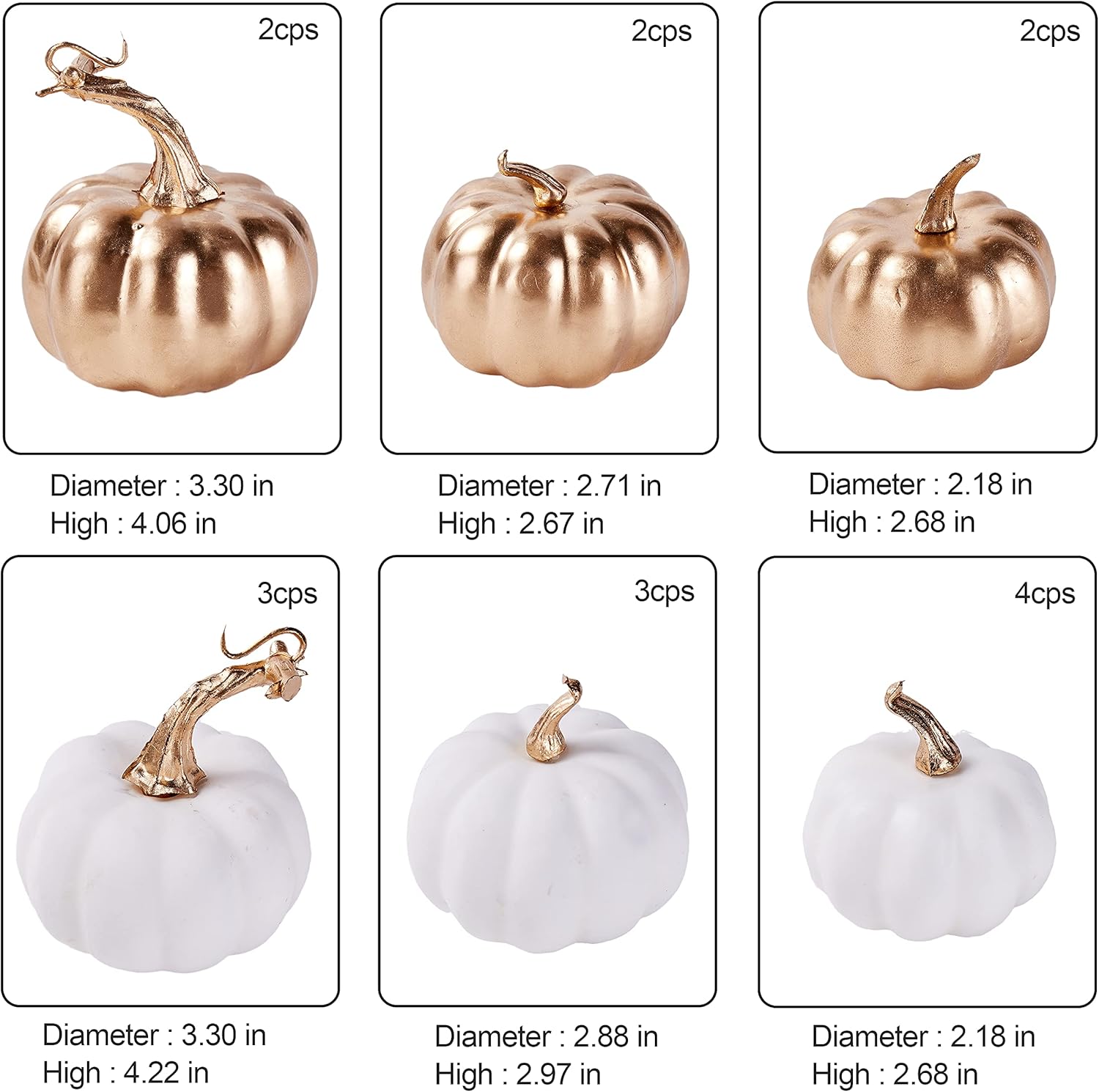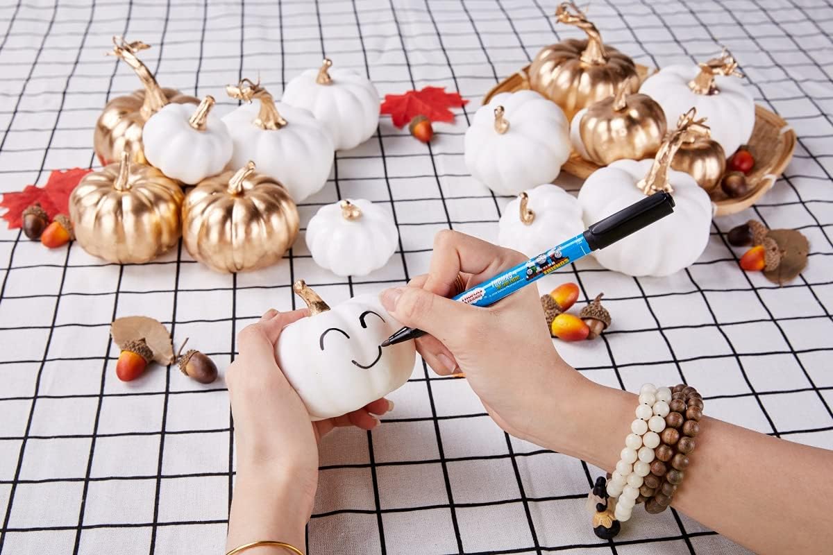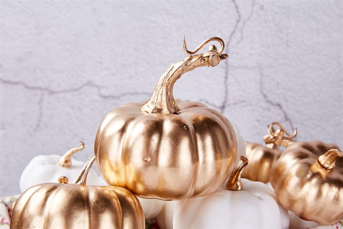 Miaikoe 16 броя различни изкуствени есенни тикви, бели, изкуствени и позлатени за декорации и цветове за Хелоуин за Деня на благодарността. Размер: Големите тикви са около 4,3 инча високи и 4,2 инча широки. Малките тикви се предлагат в различни размери от 2,4 до 3,6 инча високи и от 2,2 до 3,5 инча широки. Тази група тикви за реколта е идеална за вашите разнообразни нужди от декорация. Цвят: Изкуствените тикви са боядисани в наситено бяло и златно и са идеални за декориране според вашия вкус и съчетаване с други красиви сезонни декорации като различни елементи. Материал: тези изкуствени тикви са изработени от плътна пяна с нежно усещане при допир. Тиквите имат различни характерни форми с пластмасови стъбла, които стърчат от върховете им и изглеждат сякаш наскоро са били откъснати от лозата. Различни бели тикви за реколта са идеални за есенни декорации на маси, сезонни презентации за купи, есенни венци за врати, централни декорации за вечеря за Деня на благодарността, есенни сватбени декорации, картички за банкети, сезонни подаръци, цветни аранжировки, саксии за сочни тикви, реквизит за есенни арт проекти и учебни помагала за детска градина, реквизит за фотография и други.