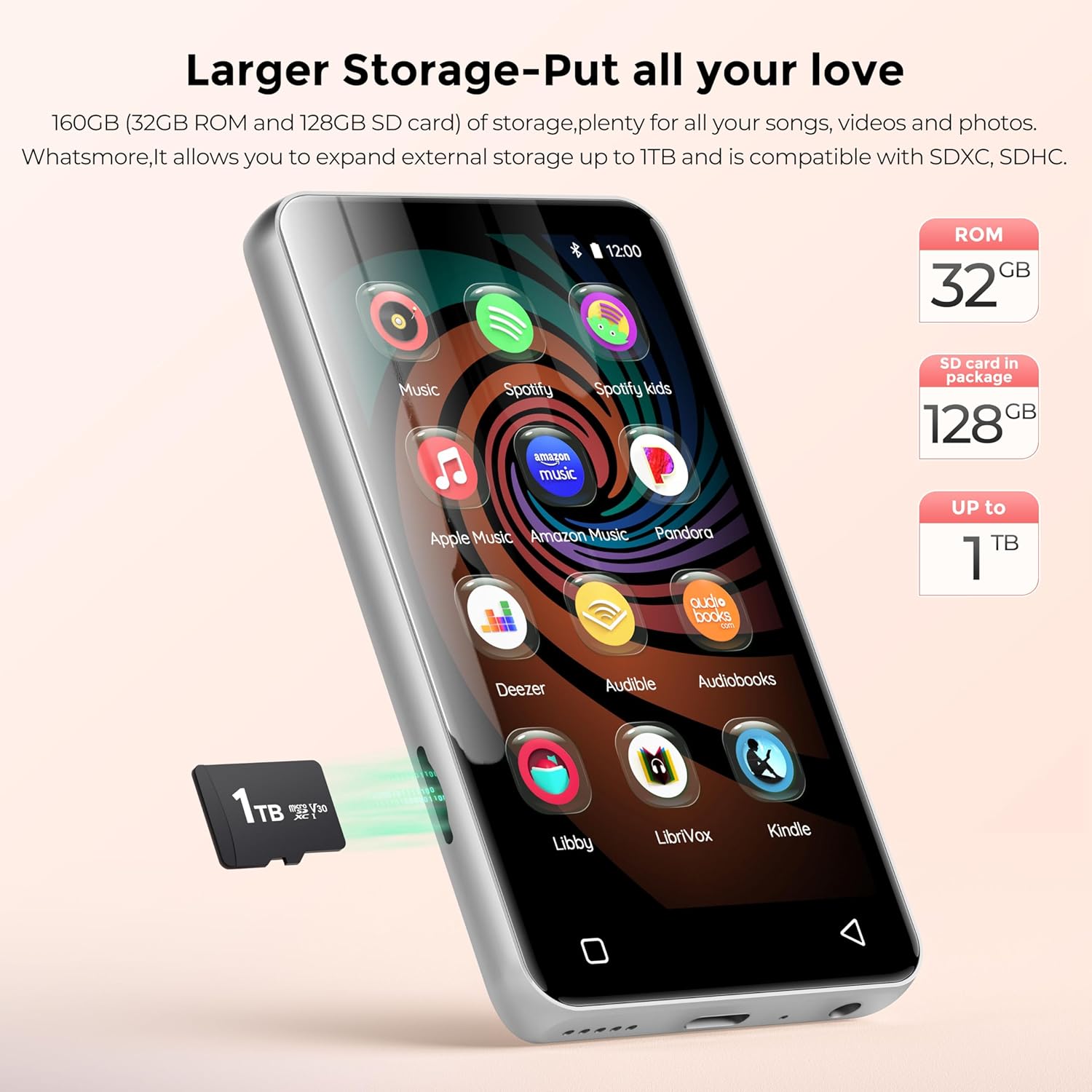 160G Spotify MP3 плейър с Bluetooth, Innioasis MP4 плейър с Amazon Music, Audible, Deezer, Hi-Fi 4-инчов музикален плейър с тъчскрийн и Wi-Fi (бял)