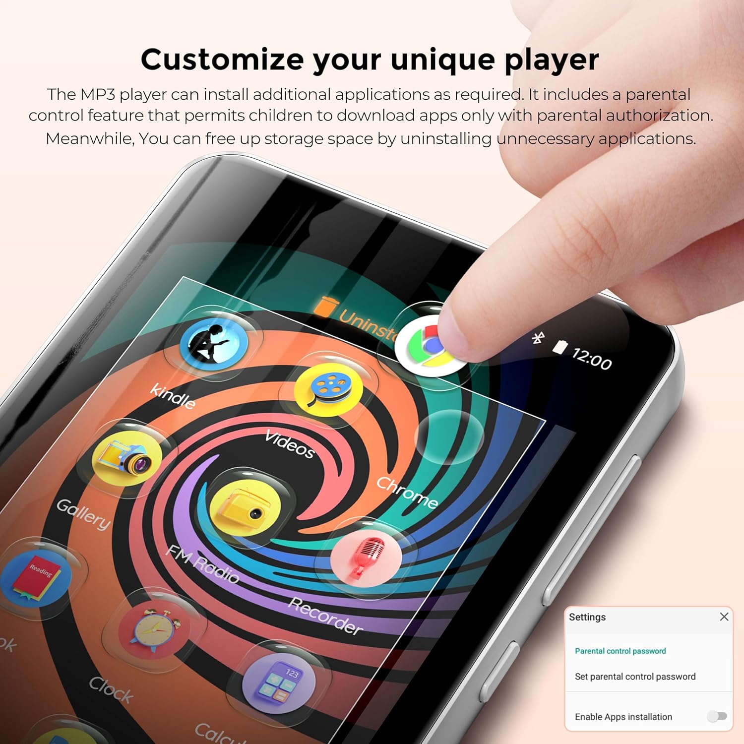 • Персонализирайте вашия MP3 плейър: MP3 плейърът с Bluetooth може да инсталира допълнителни приложения според вашите желания и да актуализира съществуващите приложения до най-новата версия. Музикалният плейър има функция за родителски контрол, която позволява на децата да изтеглят приложения само с родителско разрешение. Междувременно можете лесно да изтриете ненужните приложения, за да спестите място за съхранение. Забележка: MP3 плейърът не може да инсталира приложения, които изискват поддръжка на услуги на Google Player, като YouTube или YouTube Music.