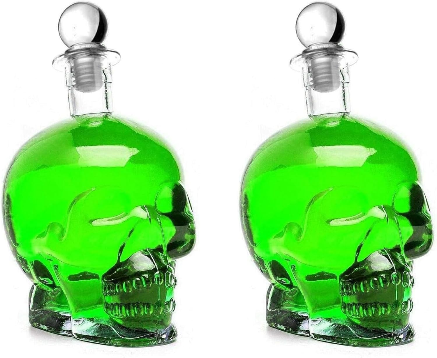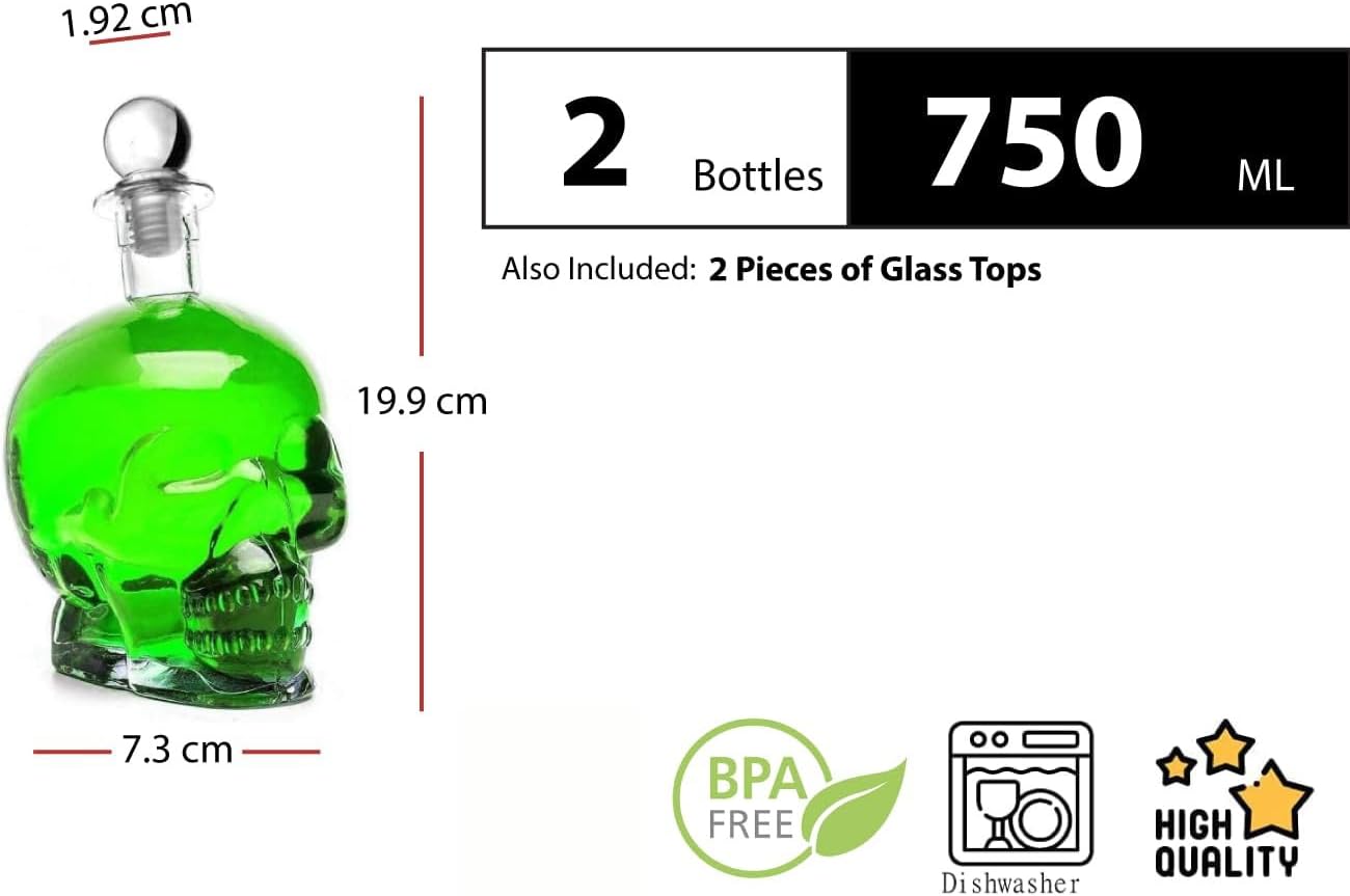 2 празни стъклени бутилки от 750 мл, дизайн с череп, произведени в Германия, бутилка с пиратски череп, стъклен череп, 0,75 литра, бутилки за ликьор, декантер за уиски, бутилка за шнапс (2 x 750 мл)