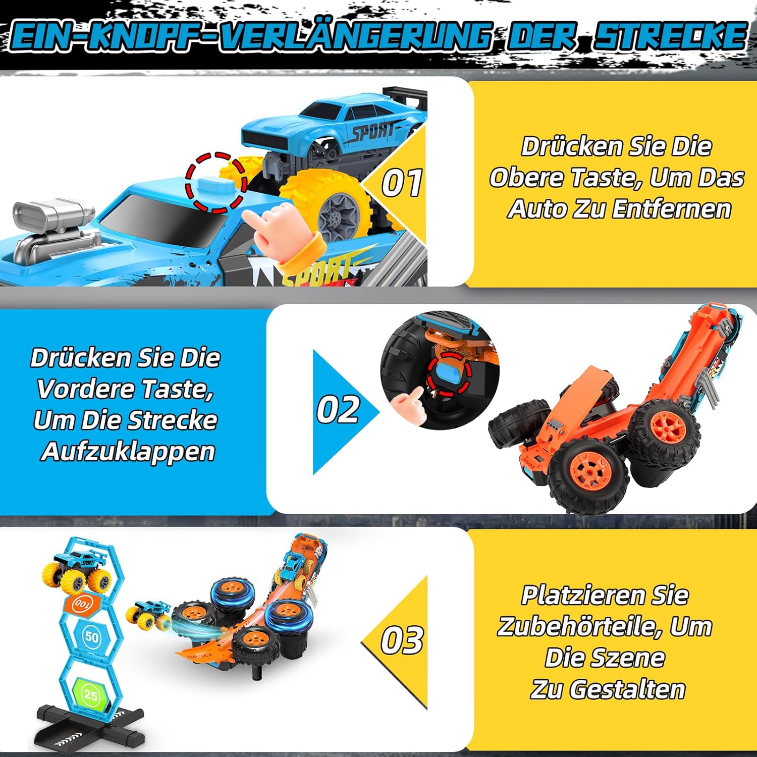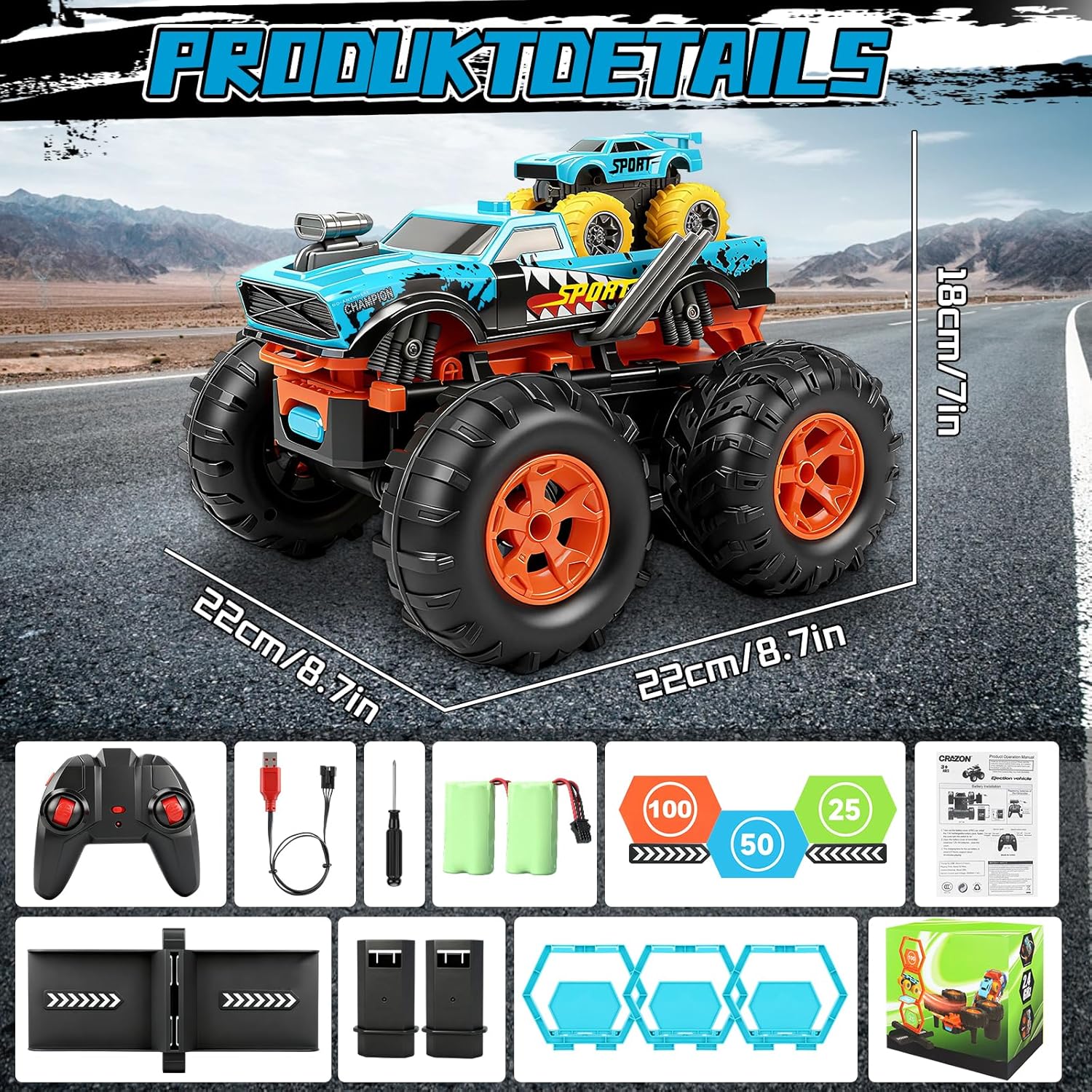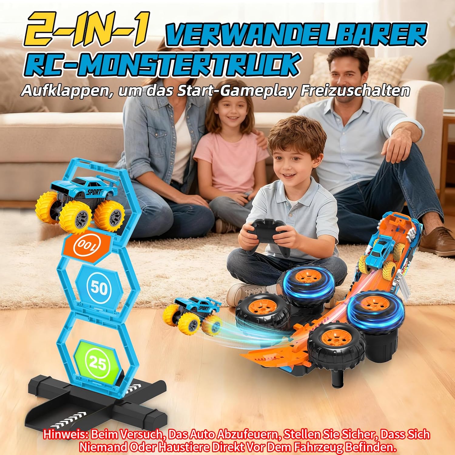 2 в 1 трансформируем RC монстър камион - едно превозно средство, два режима на игра. Децата могат да управляват монстър камиона през различен терен или да го превърнат в катапултна писта с натискането на един бутон. Оборудван с малка състезателна кола и мишена, всяка игра се превръща в креативно и вълнуващо приключение.