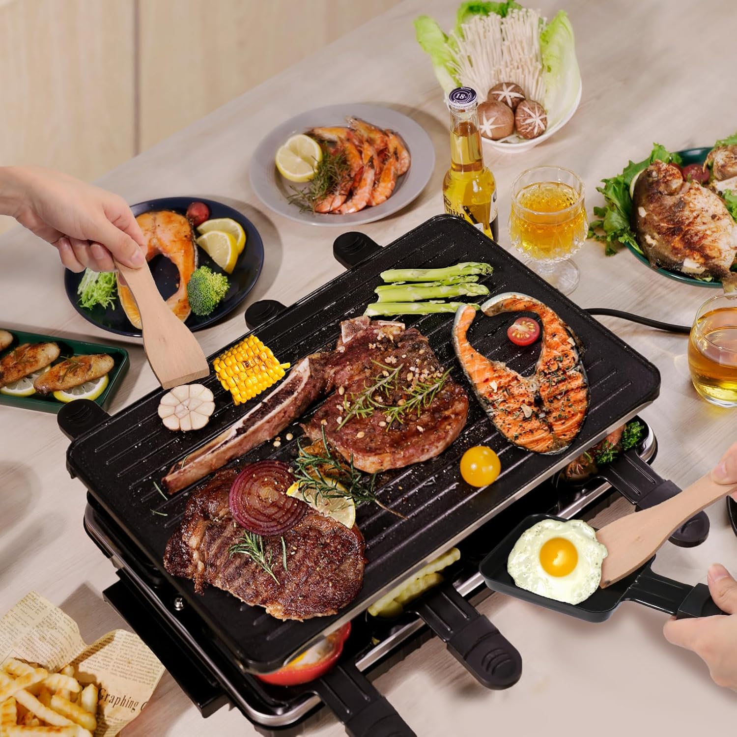 Jeder einzelnen Raclette-Auflaufform liegt ein Holzspatel zum einfachen Wenden der Speisen bei, so dass jeder bei diesem Kochwettbewerb sein Können unter Beweis stellen kann. Geeignet für Käse, Omeletts, Schokolade und mehr.
