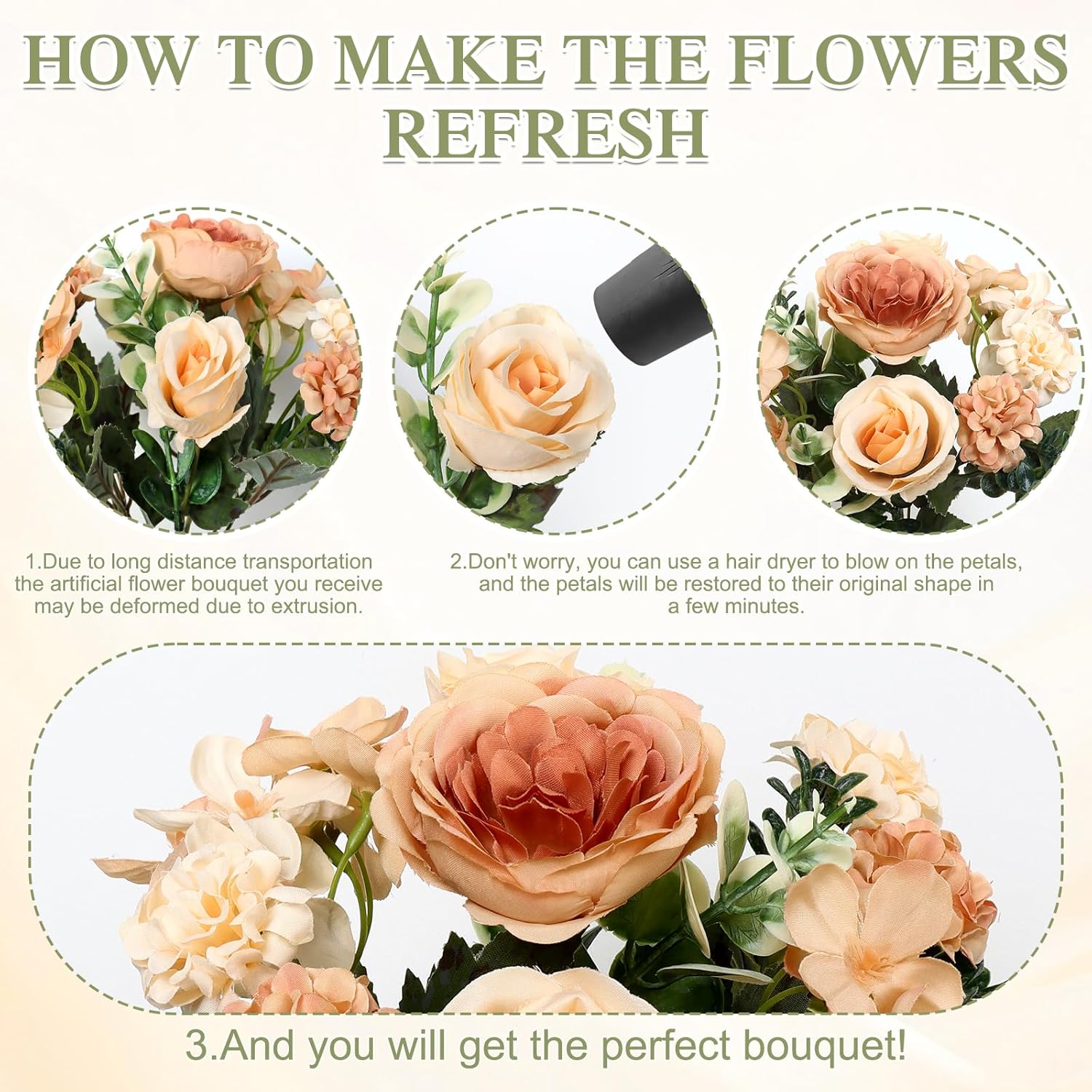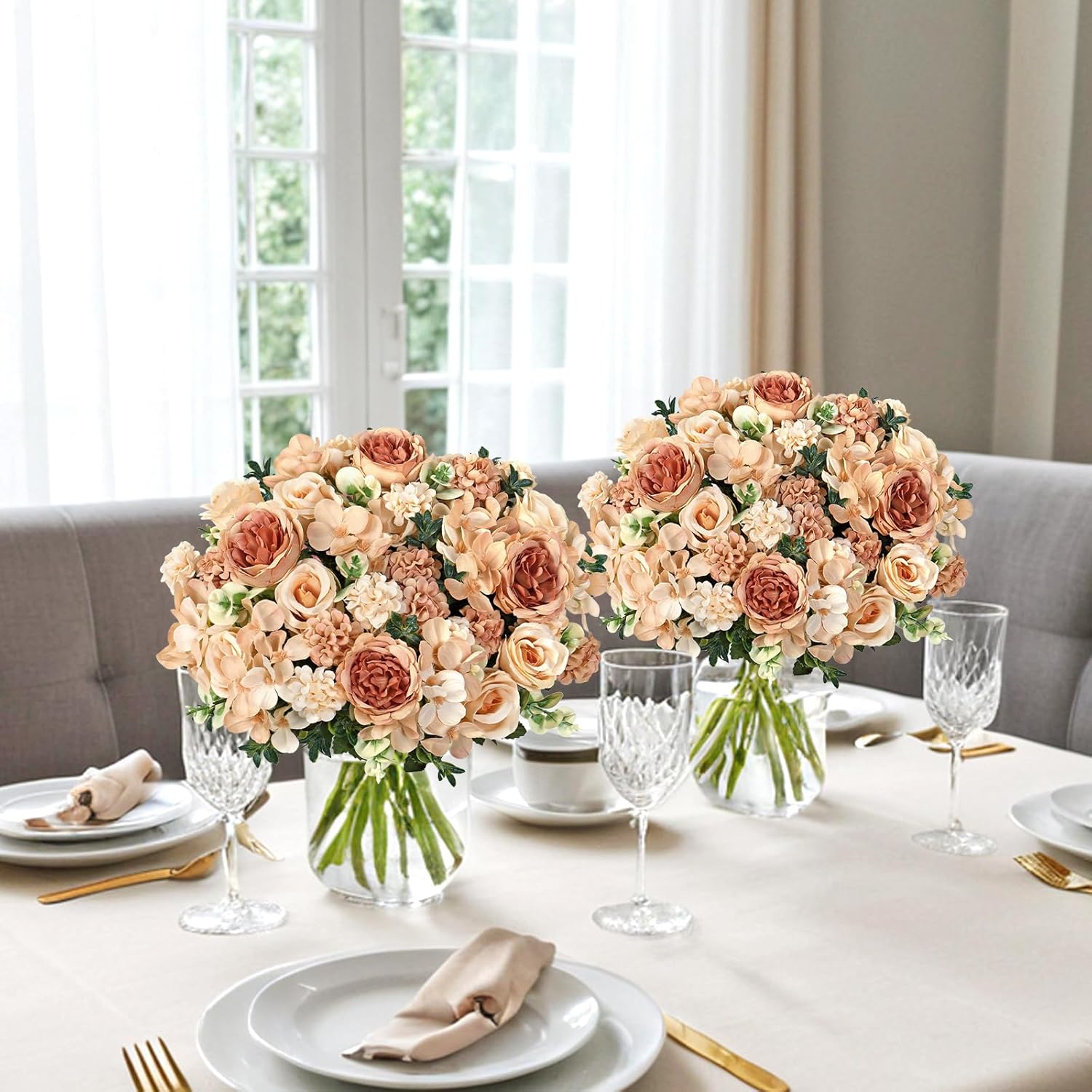 Worked perfectly for decorating kitchen tables at home. Faux silk peony roses look lifelike and elegant. Easy to decorate. Perfect for someone with no previous experience in arranging flowers