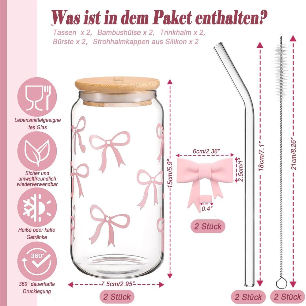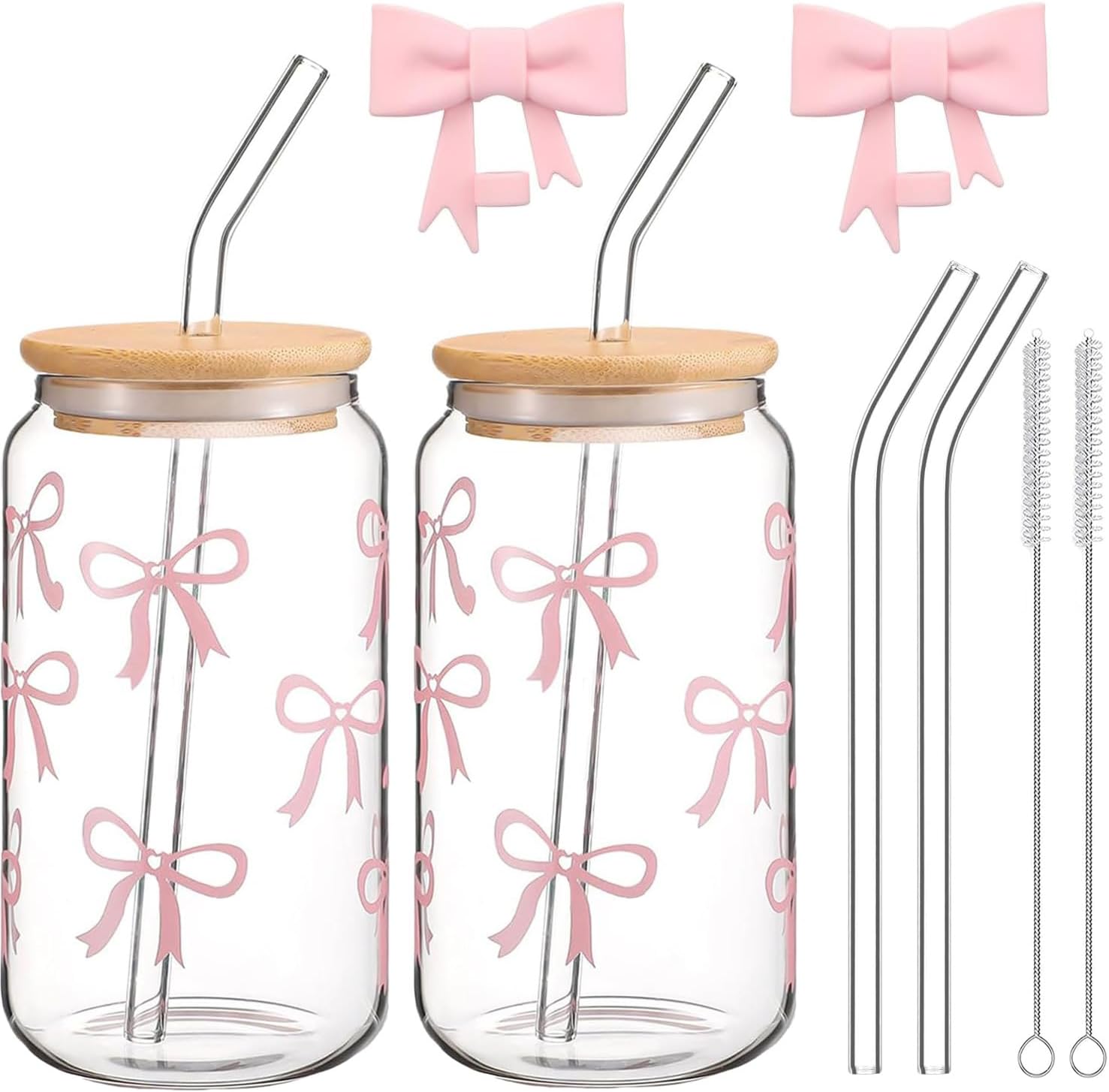 2 x 500 мл стъклени чаши за пиене с капаци и сламки, стъклени чаши с розова панделка и 2 стъклени сламки, чаши за мача за кафе, коктейли, смутита, Clean Girl Aesthetic Stuff