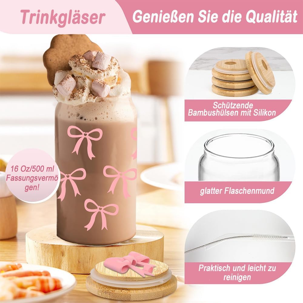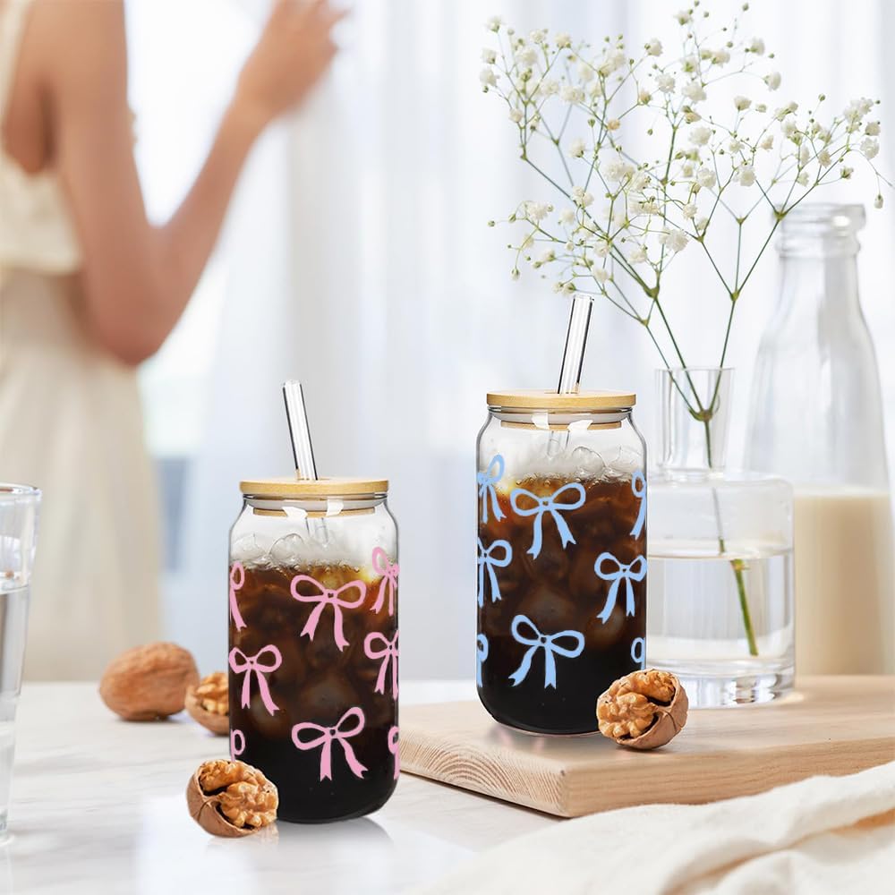 • 【Приятно пиене】Този комплект чаша с капак и сламка включва две естетически чаши от 16 унции с розови панделки, два бамбукови капака, две стъклени сламки и две силиконови капачки за сламки. Тези елементи създават деликатен и красив вид, внасяйки радост и удоволствие в ежедневието и правейки всяка напитка удобна и приятна!