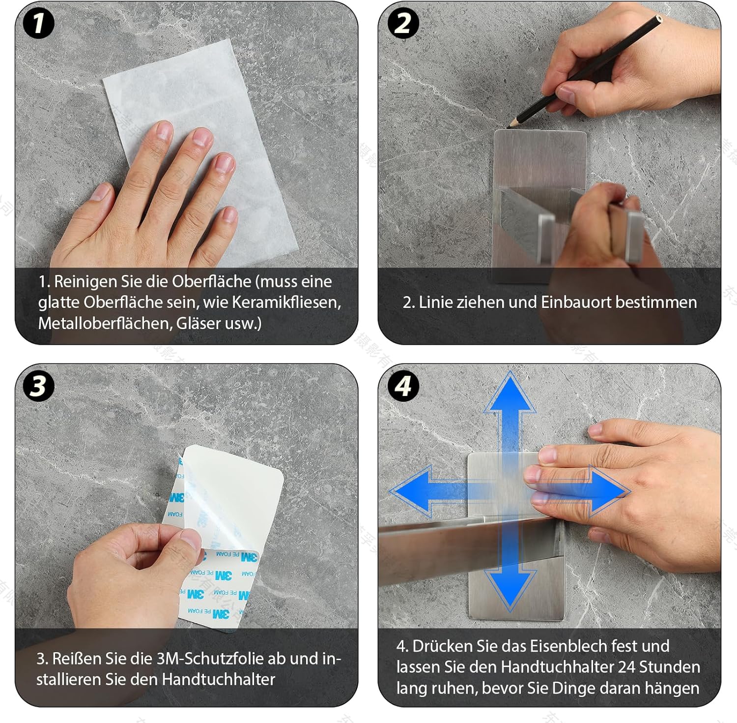 • Бележки: Този самозалепващ се държач за кърпи не е подходящ за тапети или боядисани стени. За да сте сигурни, че е здраво закрепен на мястото си, изчакайте 48 часа, преди да окачите нещата.