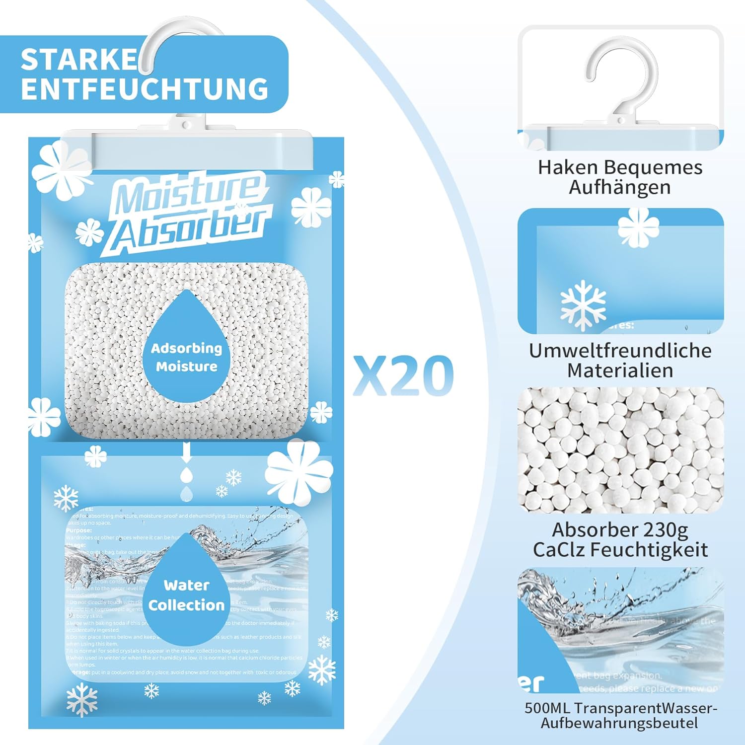 20 x 230 г Висящ влагоабсорбатор, абсорбатор на влага за гардероби за мазета, спални, бани, против влага, против мухъл, дезодорираща торбичка с влагоабсорбатор