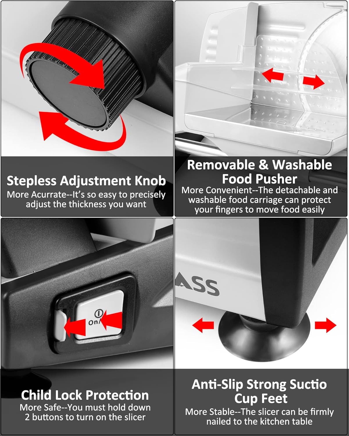 200-ватов електрически кухненски робот, неръждаема стомана, регулируем кухненски робот, от 0 до 15 мм, 2 остриета, резачка за наденици, резачка за хляб, резачка за шунка, електрически нож за месо и сирене
