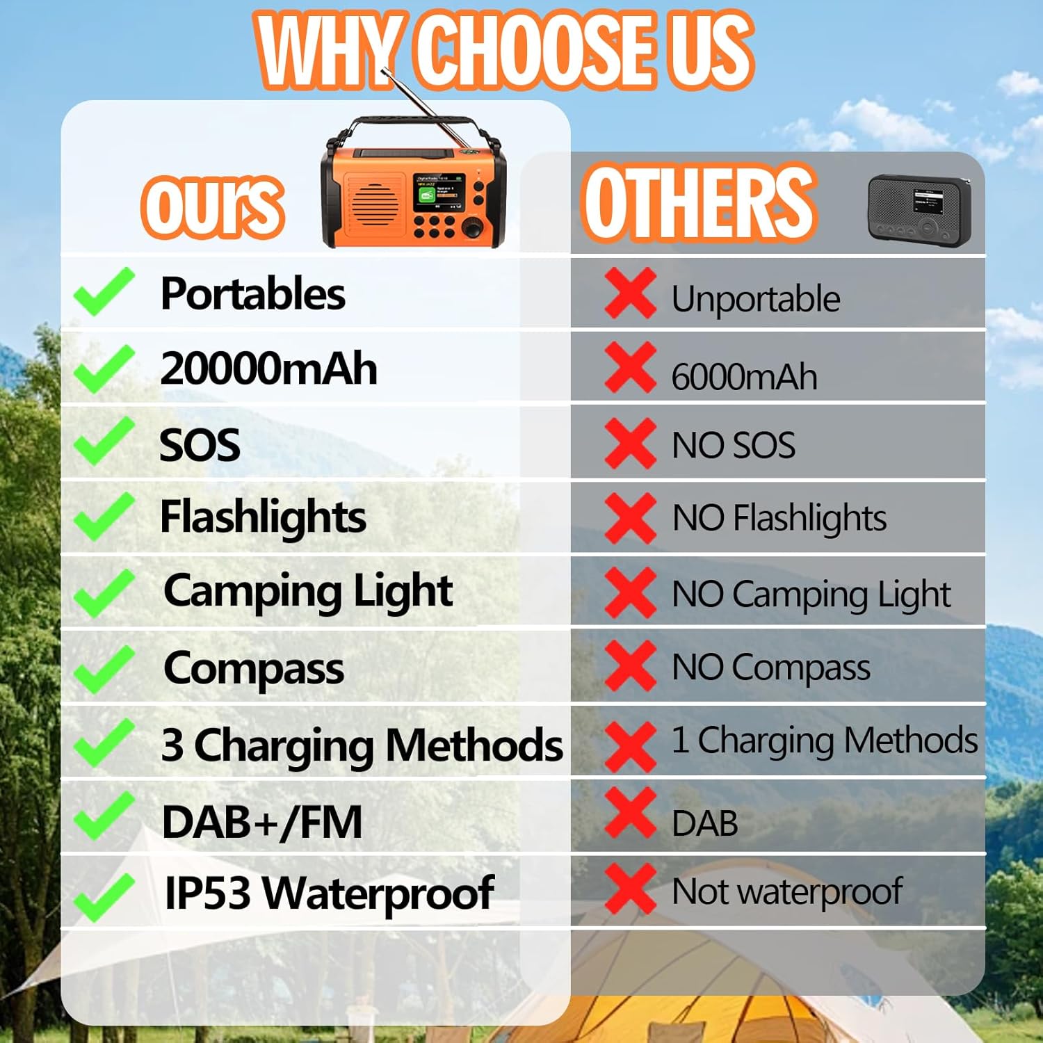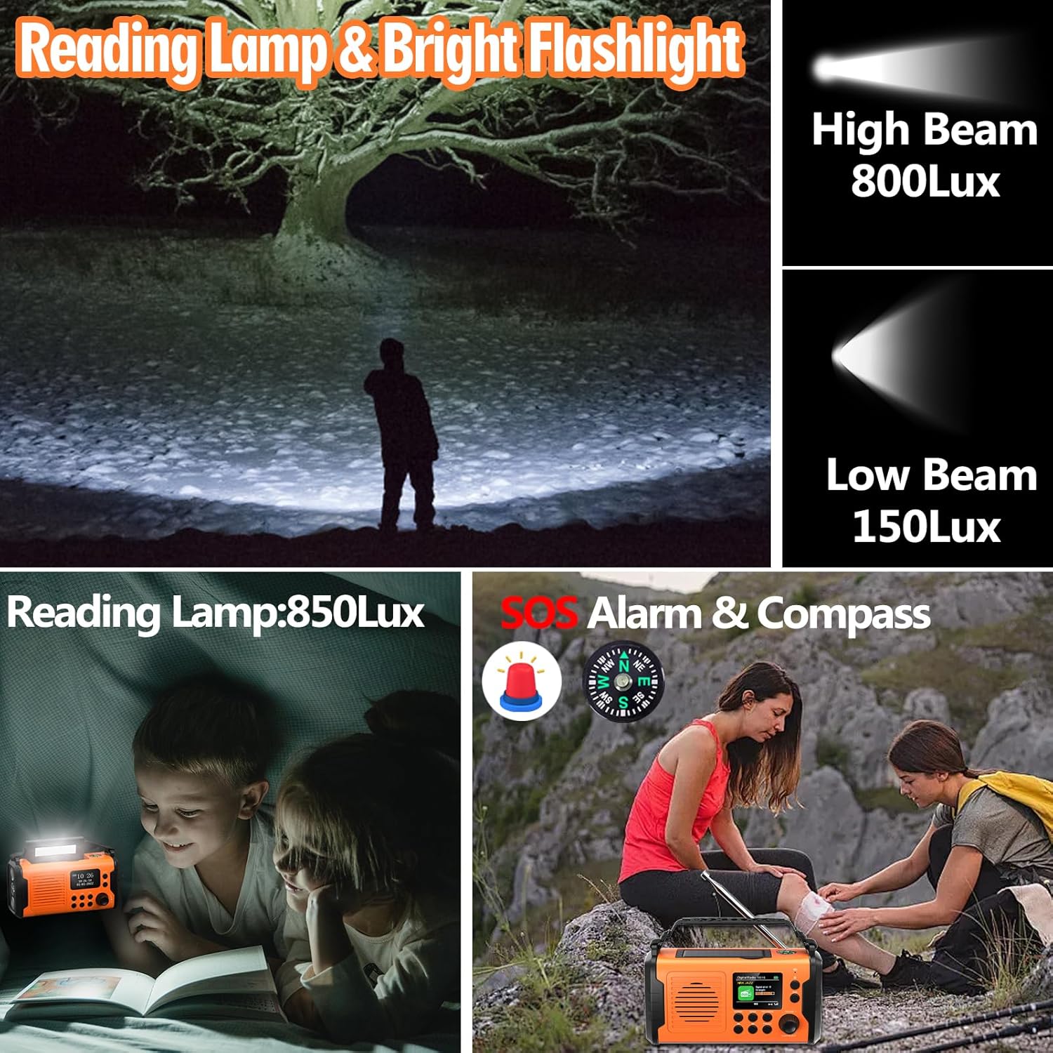 • 11-в-1 многофункционално аварийно радио: Wholede аварийното радио съчетава жизненоважни функции в компактен дизайн: 1 аварийно радио, 20000 mAh мобилна батерия, SOS аларма, ярко фенерче, LED лампа за четене, вграден компас. Bluetooth, AUX IN и TF интерфейс за карта предлагат модерни опции за забавление. TFT екран: IP53 водоустойчив. Независимо дали при прекъсване на захранването, екстремни метеорологични условия или експедиции на открито – с това многофункционално решение за захранване винаги оставате свързани, перфектната комбинация от оборудване за оцеляване и високотехнологичен комфорт.