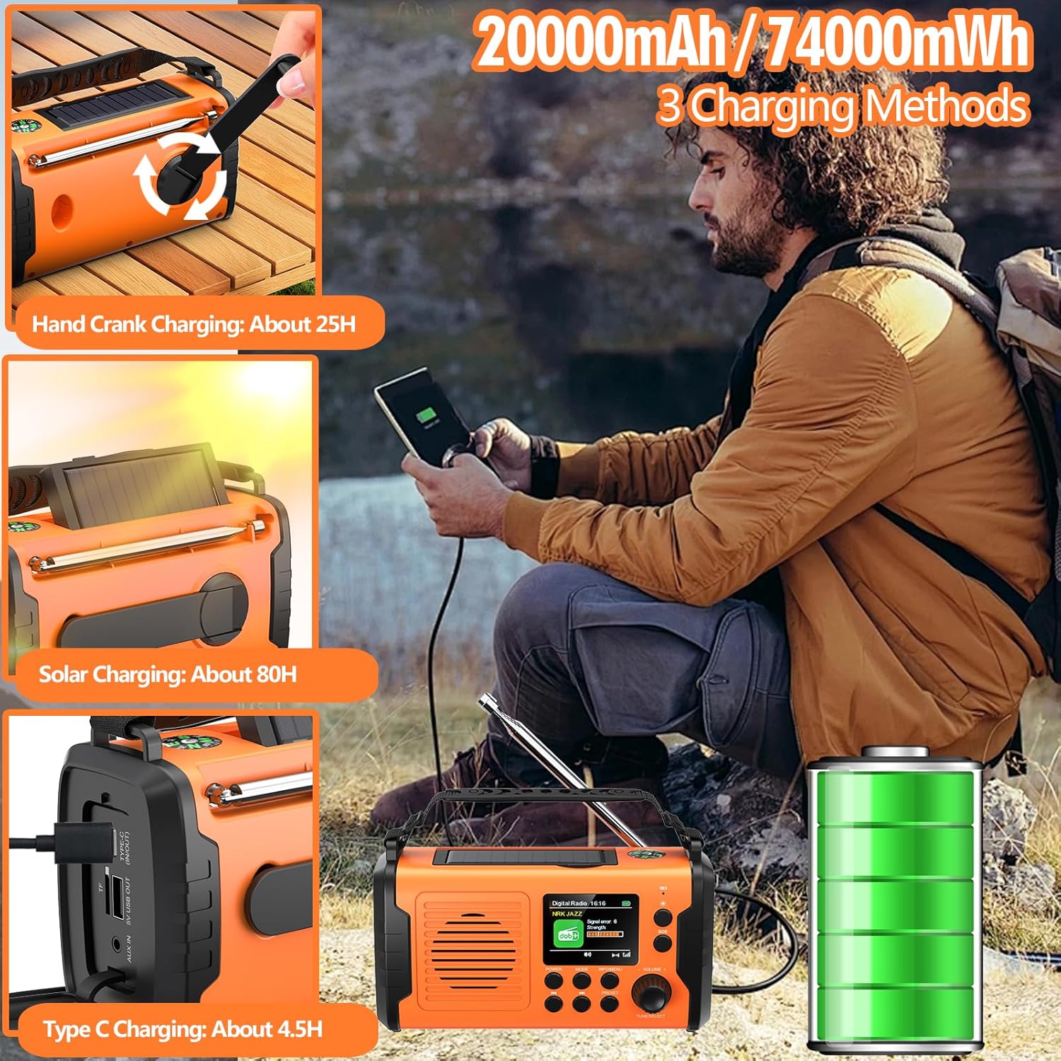 20000 mAh радио с манивела и функция за зареждане на мобилен телефон, слънчево DAB/DAB+/FM радио, 3 метода на зареждане, 11 в 1 Bluetooth 5.3 преносимо аварийно радио с външна батерия, SOS сигнал, фенерче, компас, AUX IN, TF