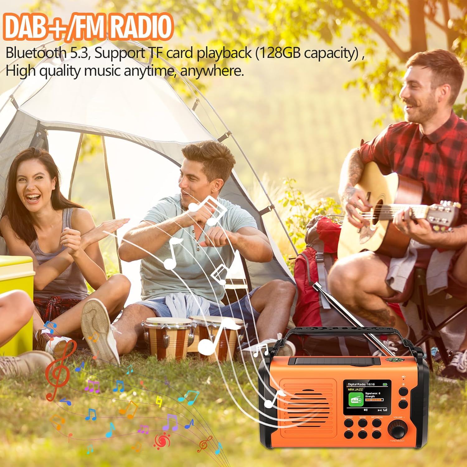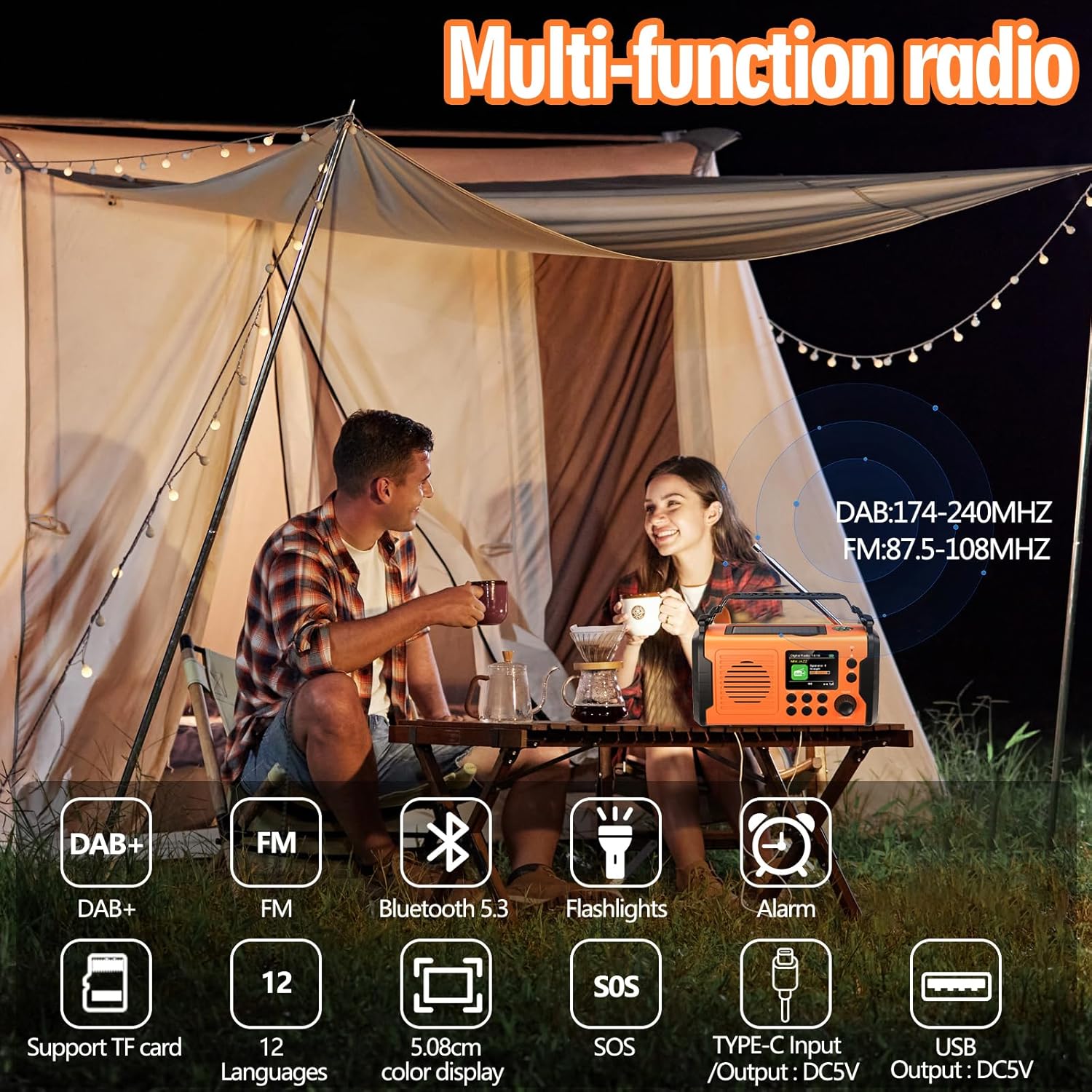 • DAB+/FM радио с колело: DAB лента (174-240 MHz) и класически FM честотен диапазон (87,5-108 MHz). Кристално чисто цифрово приемане на до 80 любими станции (40 DAB+/40 FM) благодарение на лесна настройка и бързо автоматично търсене. Това е вашият перфектен партньор за приключения на открито и кризисни ситуации: вградената SOS функция за аларма, прецизният компас и яркият LED фенер с функция за четене го правят незаменим спътник за туристически преходи, прекъсвания на електрозахранването или аварийни ситуации. Компактният корпус съчетава издръжливост с преносимост, така че винаги сте добре информирани, защитени и забавлявани.