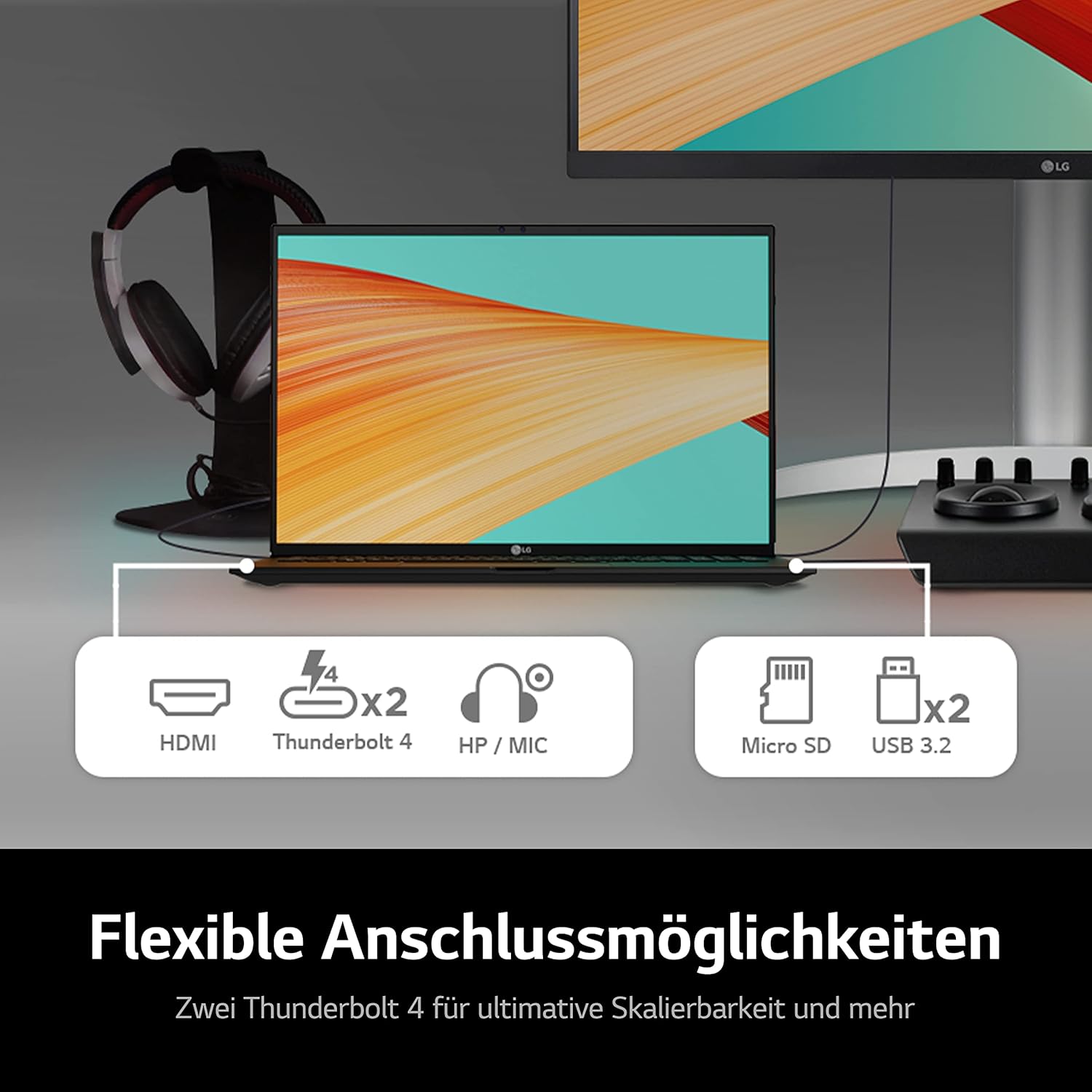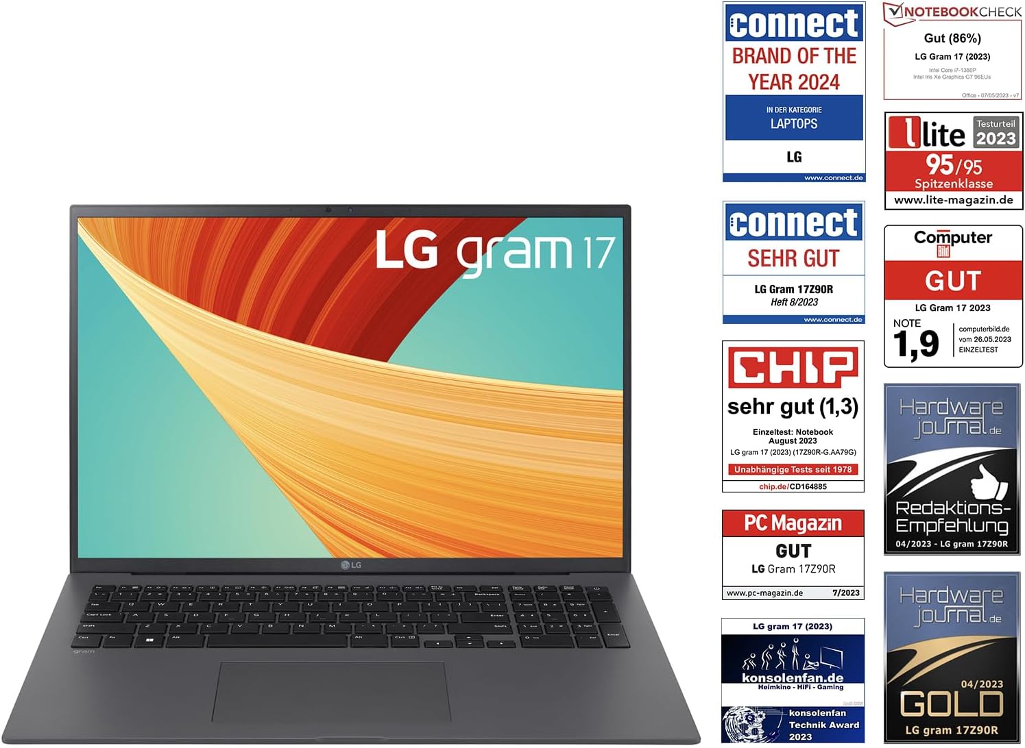 2023 LG Gram 17-инчов ултралек лаптоп - 1350 г Intel Core i7 лаптоп (16GB RAM, 512GB SSD, 20 часа живот на батерията, 16:10 антирефлексен IPS дисплей, Thunderbolt 4, Win 11 Home, Mirametrix) - сив