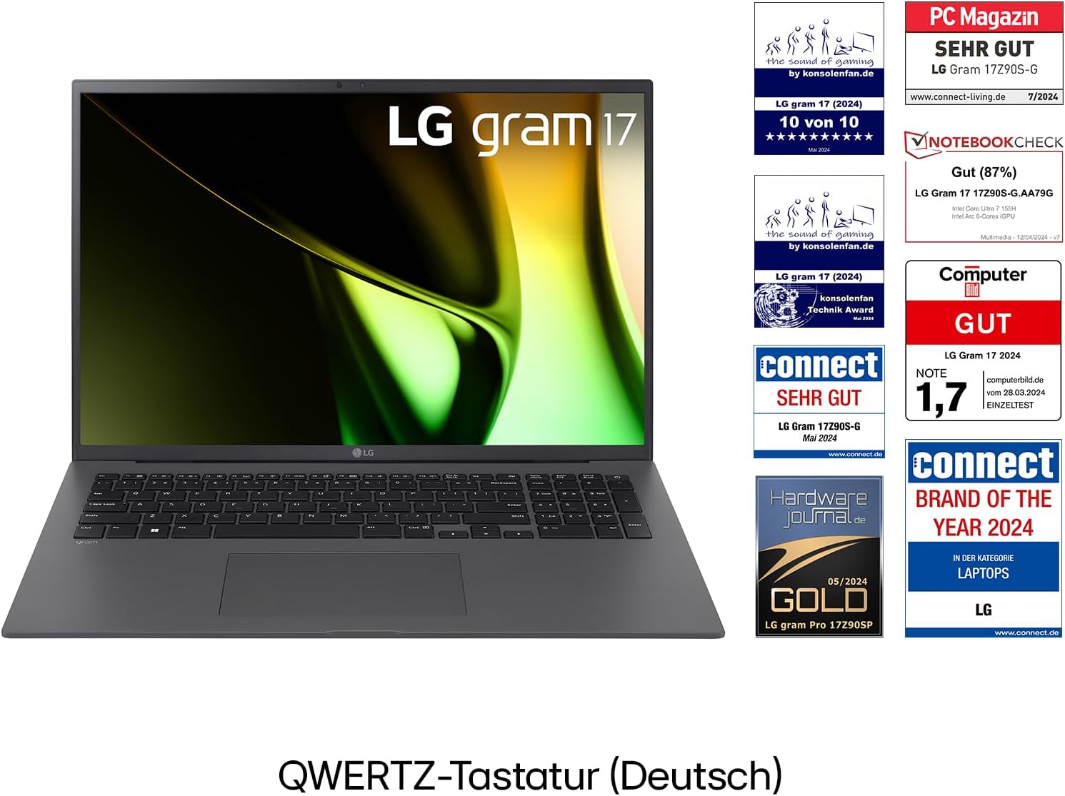 2024 LG gram 17-инчов лаптоп - 1350 g Intel Core Ultra7 лаптоп (16GB RAM, 1TB Dual SSD, 21.5h живот на батерията, IPS панел с антирефлексно покритие, Win 11 Home) - сив