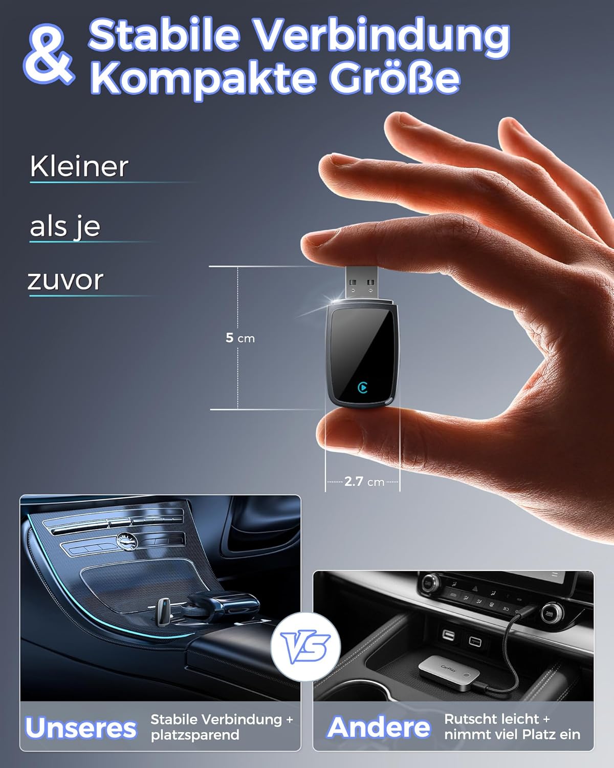 • Компактен и издръжлив: Този CarPlay адаптер е с mini-USB дизайн, който е с 50% по-малък, елиминирайки бъркотията от кабели. Елегантният метален корпус не само осигурява модерен външен вид, но и осигурява по-добро разсейване на топлината, предпазвайки USB порта на автомобила от прегряване.