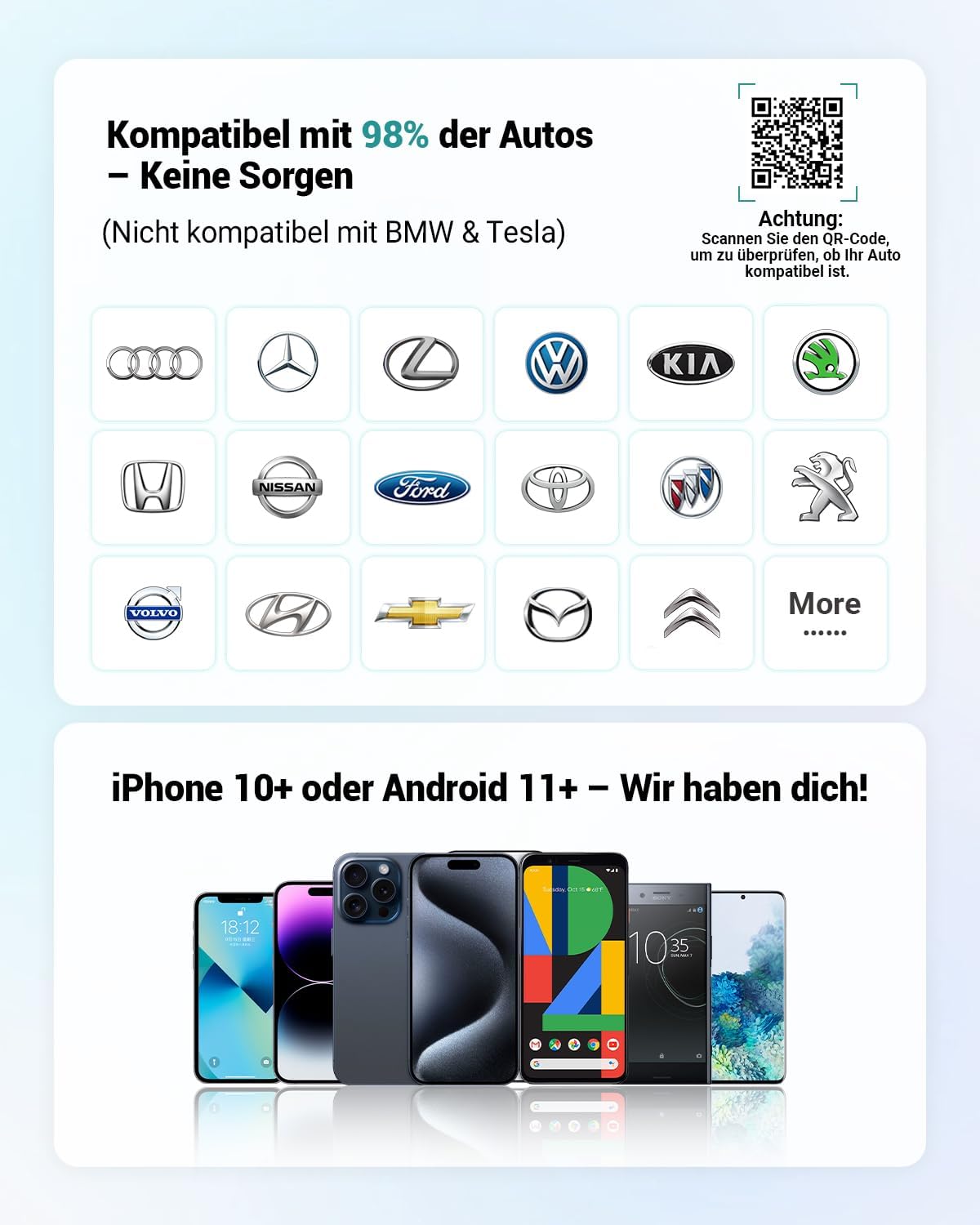 • 【Съвместимост? Няма проблем – работи с 98% от всички автомобили!】Чудите се дали колата ви е съвместима? С адаптера Ottocast CarPlay сте на сигурно място! Той поддържа над 98% от всички превозни средства – това е почти всяка кола на пътя (съжалявам, шофьорите на BMW и Tesla!). Дори и да шофирате по-стар модел, можете да превърнете колата си в технологична електроцентрала с интелигентно подобрение. Не сте сигурни дали е подходяща? Просто се свържете с нас – ще се радваме да помогнем! Край на извиненията от рода на „Няма да работи с вашата кола“!