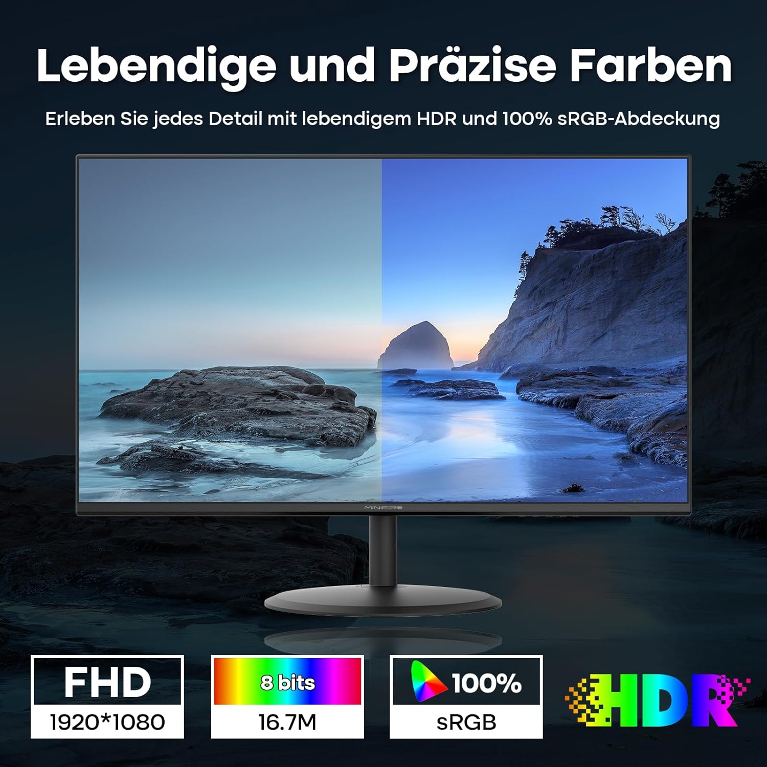 22-инчов бизнес компютърен монитор Minifire, настолен геймърски монитор, IPS, FHD 1080p, 75 Hz, адаптивна синхронизация, комфорт за очите, sRGB 110%, ултратънка бленда, наклон, VESA, HDMI, VGA, черен екран за компютър