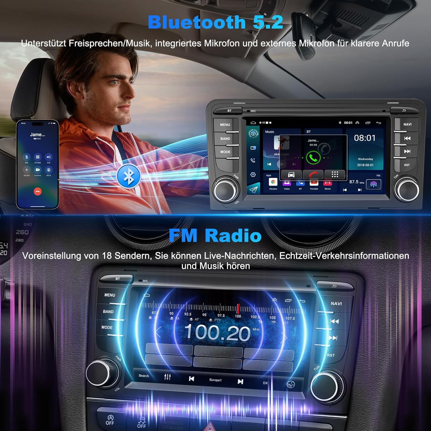 The Bluetooth technology allows convenient hands-free calling and audio streaming. Safe easy pairing, voice recognition and phone book function, Siri Eyes Free Voice is supported. Audi RS3 head unit, built-in microphone with noise cancellation and equipped with an external microphone to ensure you receive a clear call.