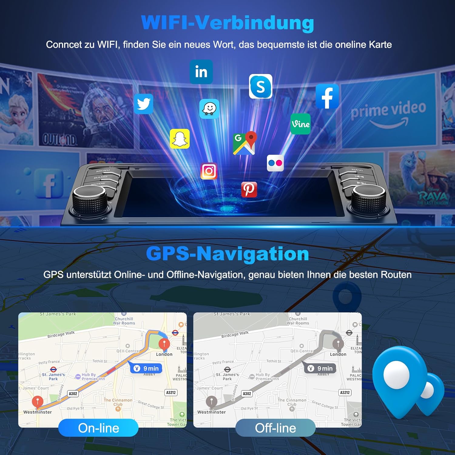 Android 12.0 operating system 2G RAM & 32G ROM. Supports wireless/wired CarPlay and Android AUTOWiFi connection: Built-in WiFi module, can connect to the Internet via a WiFi hotspot, download the app to watch online videos etc. GPS navigation: Built-in navigation module, support online offline navigation, free navigation mapBluetooth function: Built-in Bluetooth module, supports Bluetooth phone connection, hands-free for calling or Bluetooth music playbackup function: Supports the input of the rear view camera, the rear view car safer and more convenient (free camera is included in the package)Radio tuning: Supports FM radio, FM1 / FM2 / FM3 87.5-108 MHz, you can listen to the radio you are interested in. Rear dual USB port input: Supports the USB input of the rear cable, can play music/movies or cable CarPlay Android car. Screen: 2.5D capacitive 7 inch IPS touch screen, resolution 1024 x 600, supports 1080P video