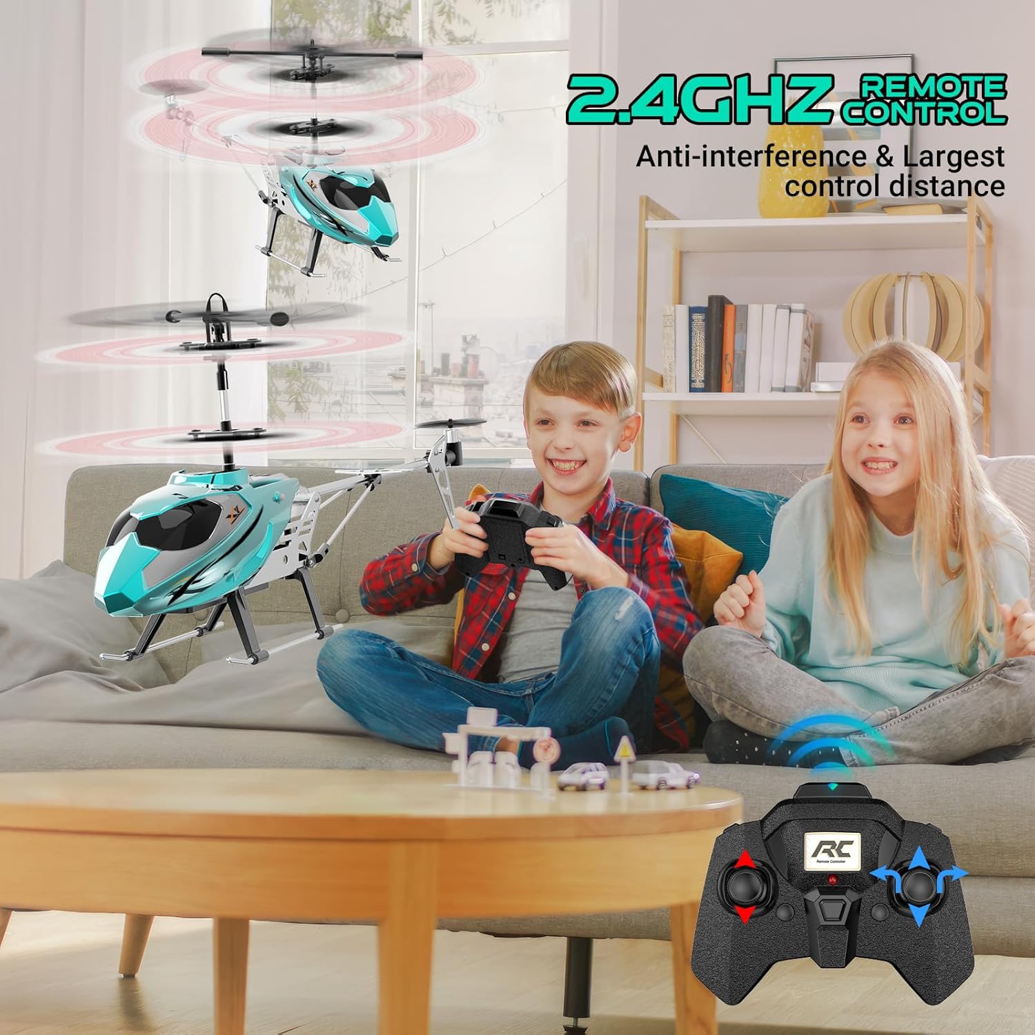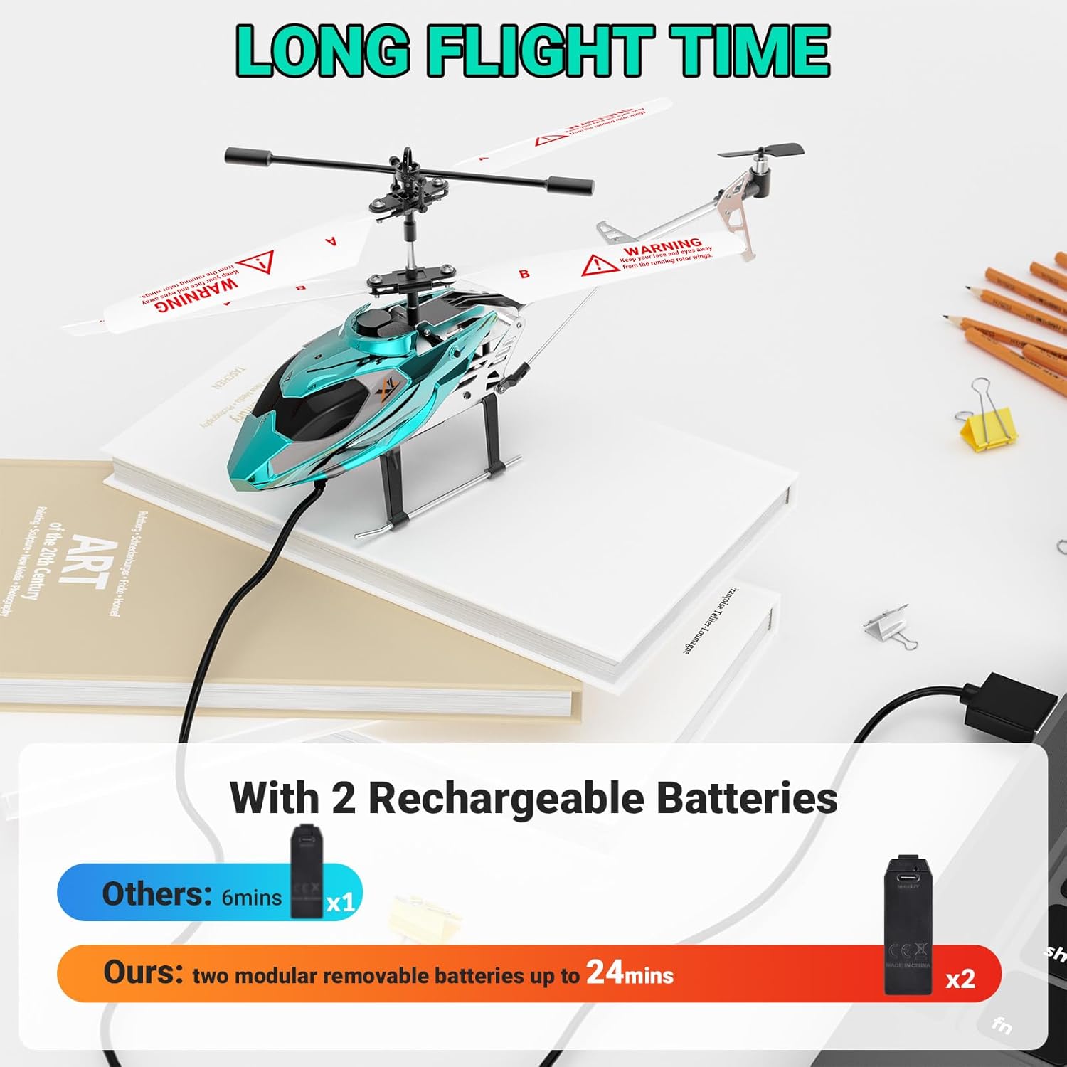 The 2.4GHz helicopter comes with two powerful modular batteries with large capacity. You can use the batteries alternately, so you get twice the playing time. You can fully enjoy the driving fun more than 24 minutes (12 minutes each). Shorter charging time and longer playing time ensure a better gaming experience for children.
