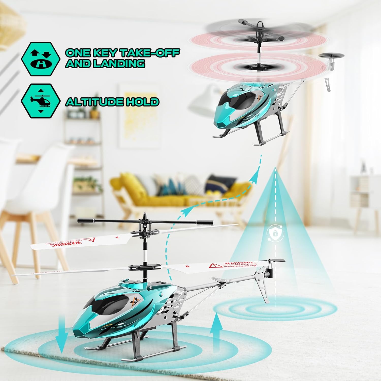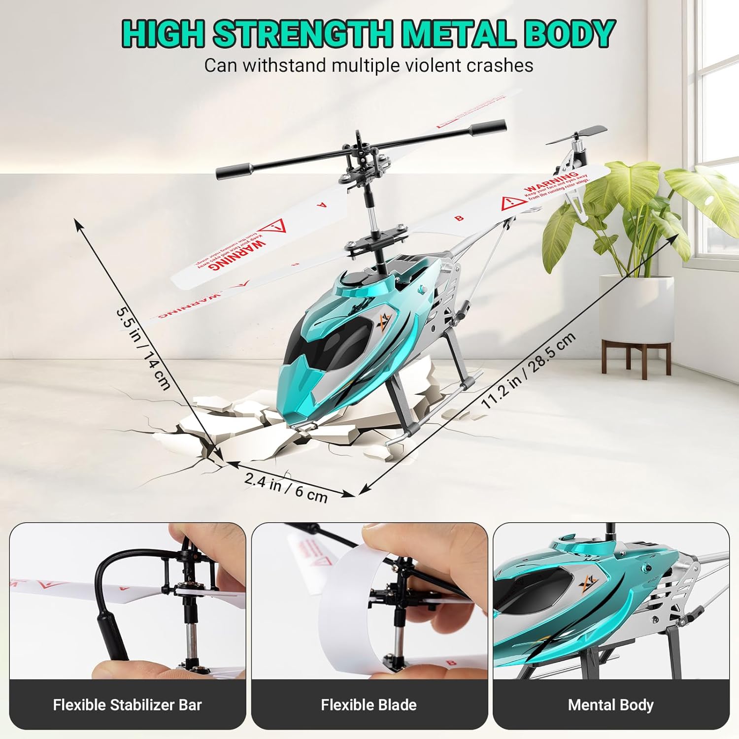 The helicopter features a high-quality alloy structure, a solid shell and flexible rotor blades. It not only looks cool, but also has excellent drop and collision resistance. Not easily deformed or damaged after impact. When the helicopter is stuck, the power supply is automatically interrupted and the flight is stopped, minimising damage to children and furniture.