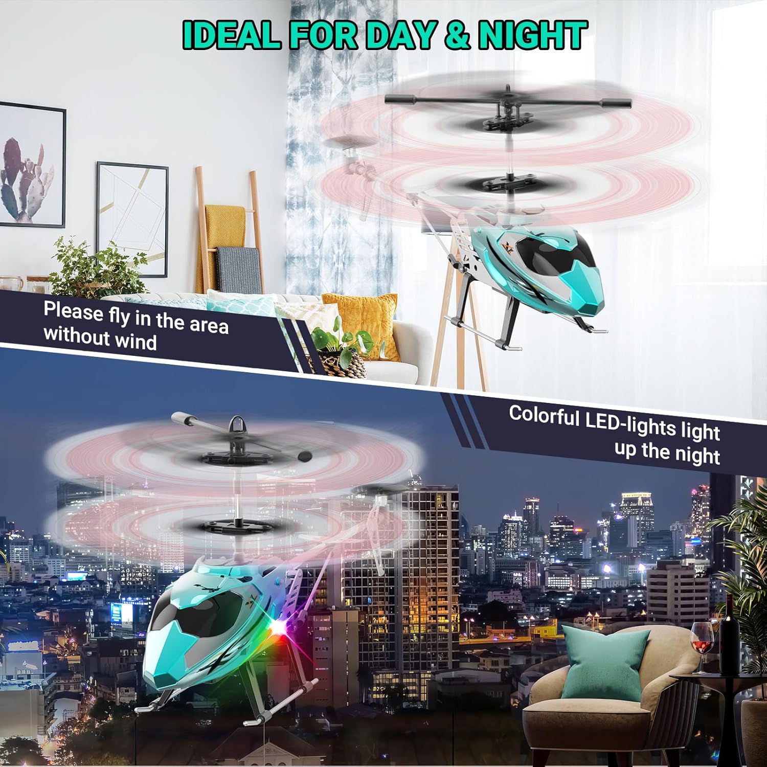 Colorful LED lights make 3.5 channel helicopters fly easily in the dark. The glowing lights make the night flight more colourful, easier to see and have a strong attraction to children. So you won't get lost when flying in the dark! The RC helicopter is not only a toy, but a high-tech masterpiece that can bring you endless fun and challenges.