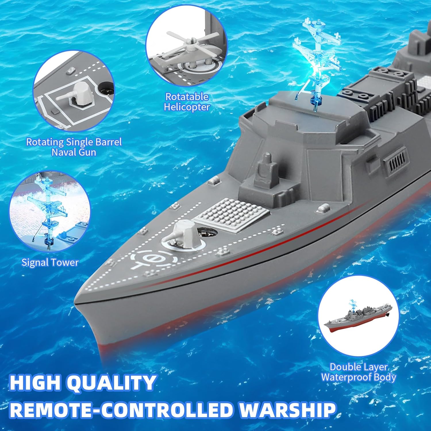 • Пластмасови материали и висока симулация: дистанционно управляваният военен кораб е изработен предимно от ABS материал, който притежава свойствата на издръжливост, уплътнение и херметичност. Има висококачествено симулирано океанско сиво покритие.