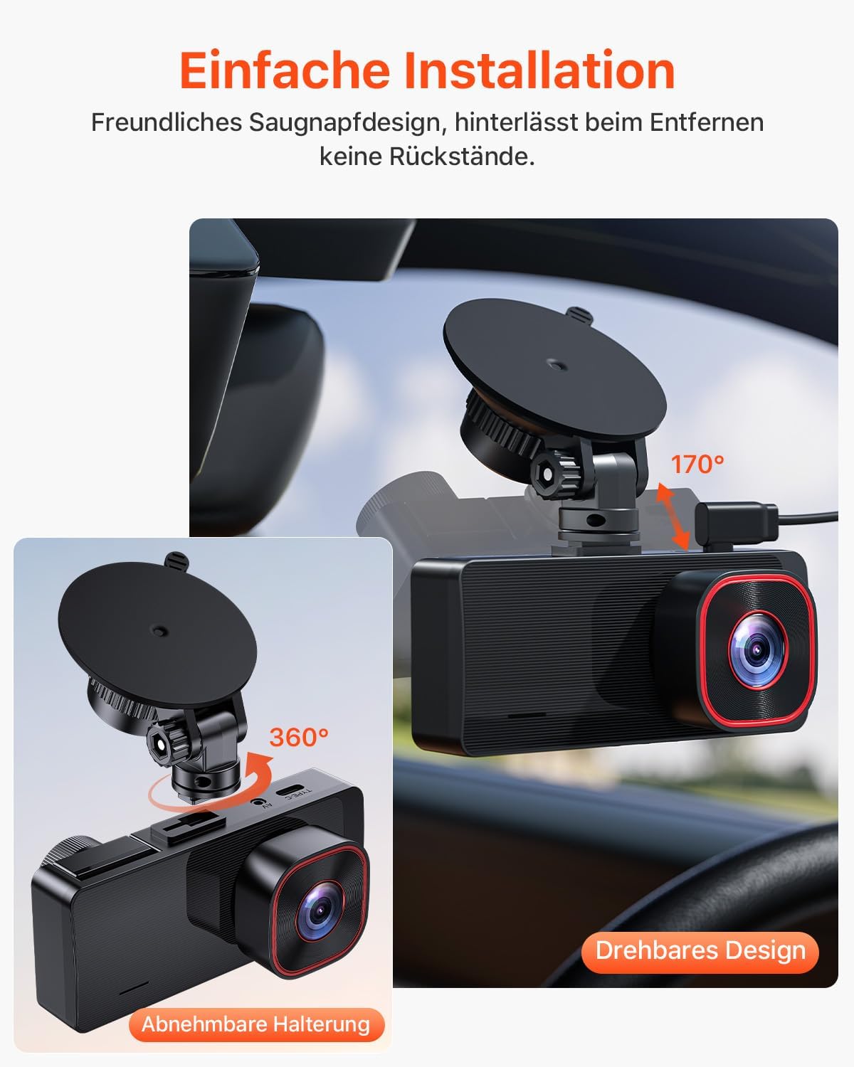 • ДИЗАЙН С ВЕНДУЗА И РЕГУЛИРУЕМА СТОЙКА — Видеорегистраторът Bestsee е с удобен за потребителя дизайн с вендуза за безпроблемен монтаж и демонтаж. Този дизайн осигурява лесно отстраняване на видеорегистратора от предното стъкло на автомобила ви, което ви позволява удобно да преглеждате записаните видеоклипове на екрана. Стойката може да се завърта на 360 градуса хоризонтално и вертикално, което ви дава гъвкаво регулиране на позицията на монтаж.